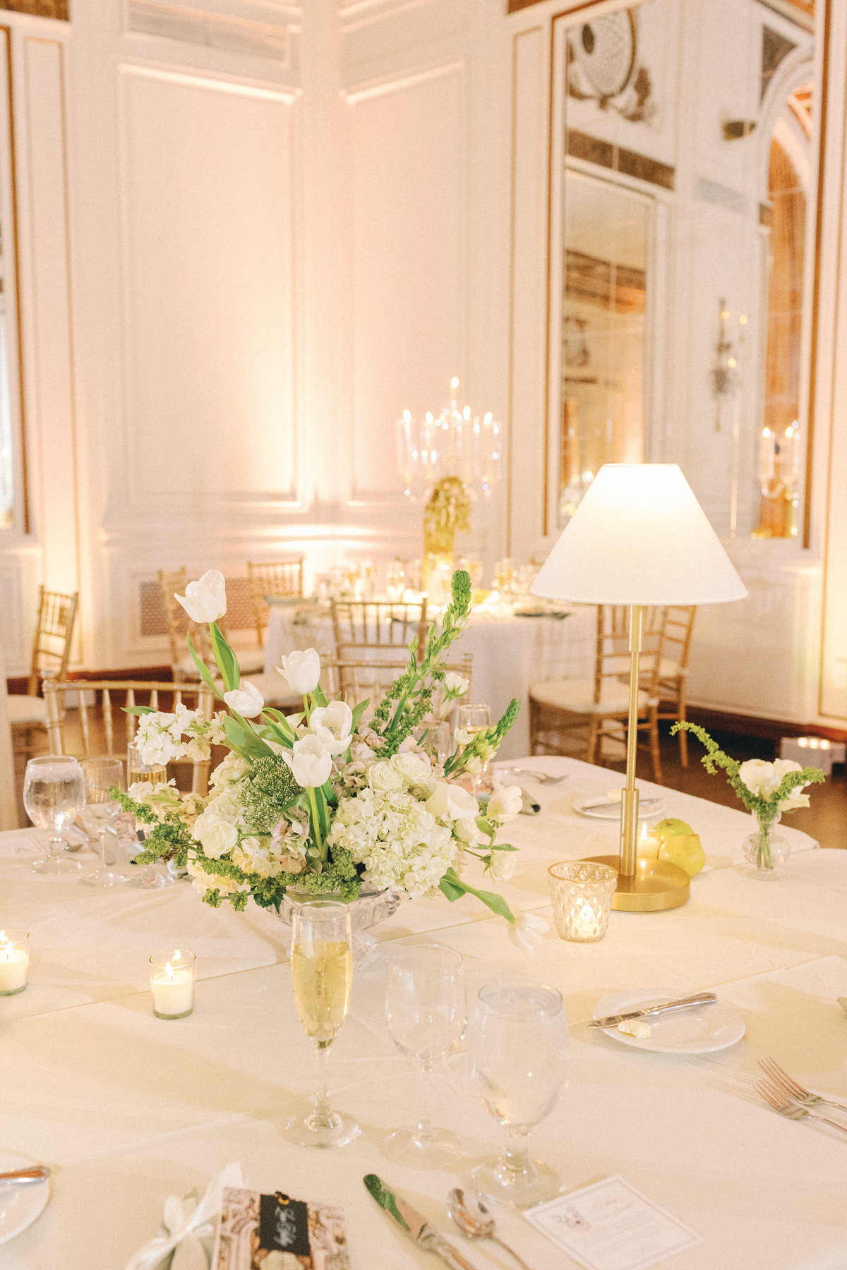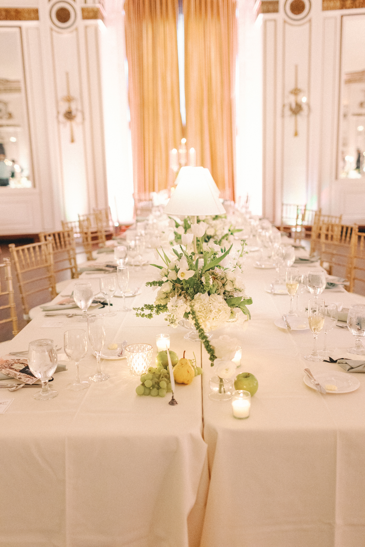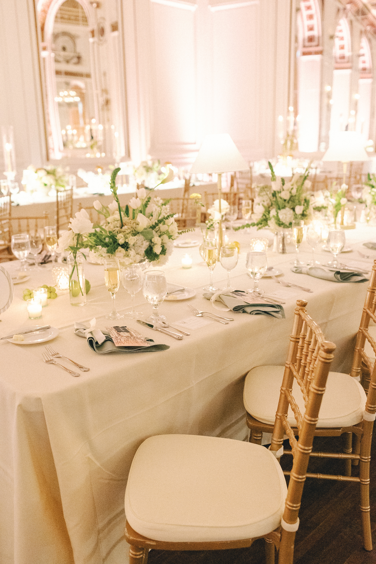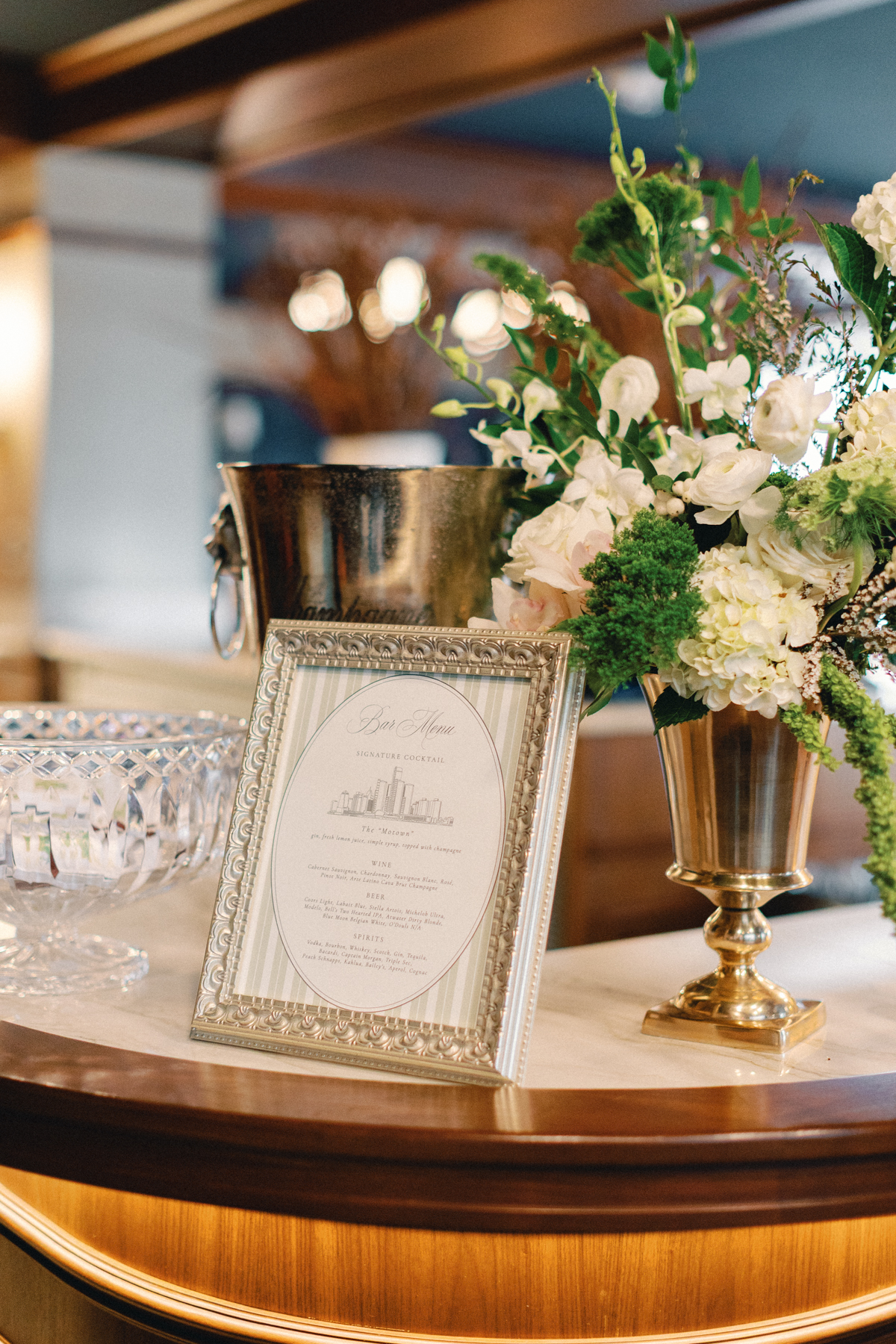 The reception at the this Colony Club Detroit wedding was the definition of timeless romance. Inside the grand ballroom, gilded chandeliers sparkled over candlelit tables draped in custom linens. Tall white-and-green floral arrangements and bud vases lined the tables, while fruit accents like pears and grapes added a European flair. Table lamps glowed softly, illuminating custom menu cards adorned with illustrations and white satin bows tied around green napkins.