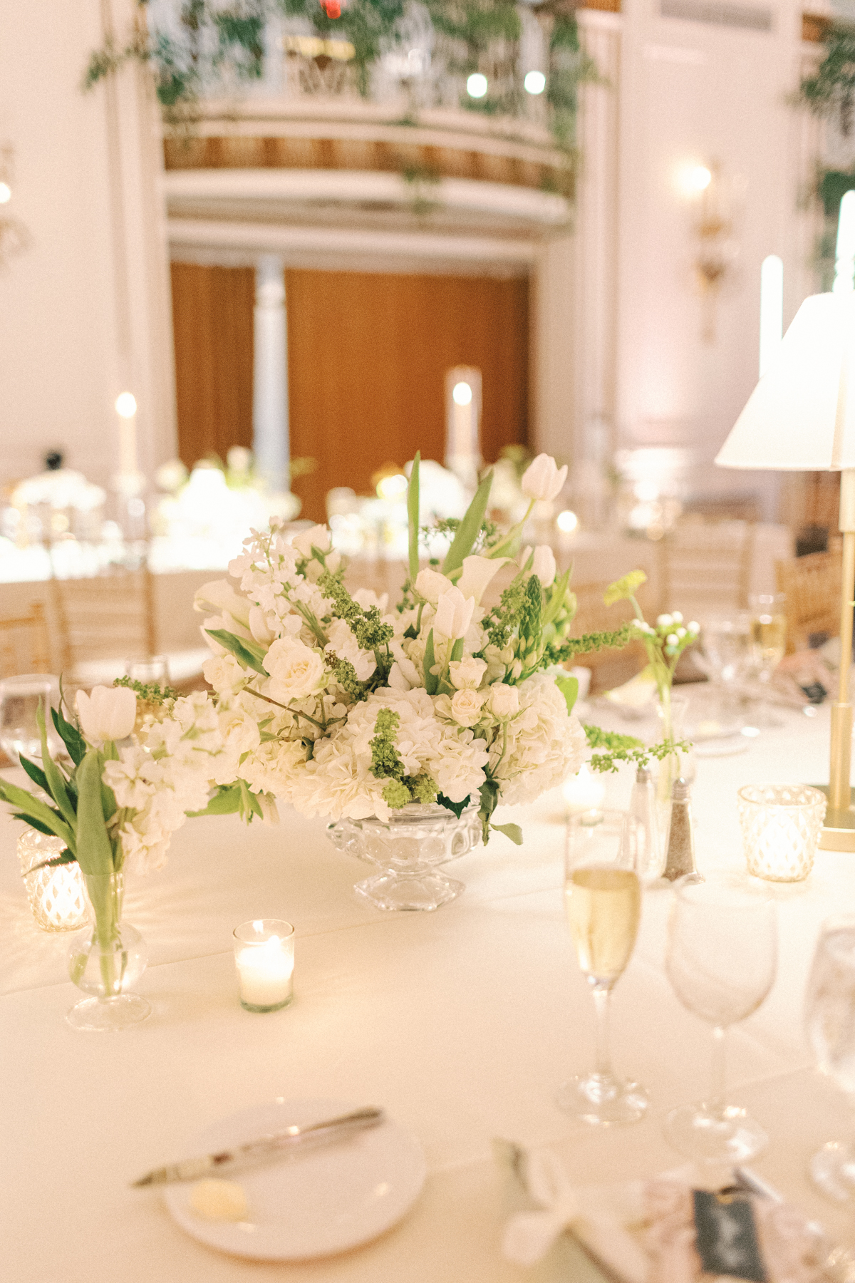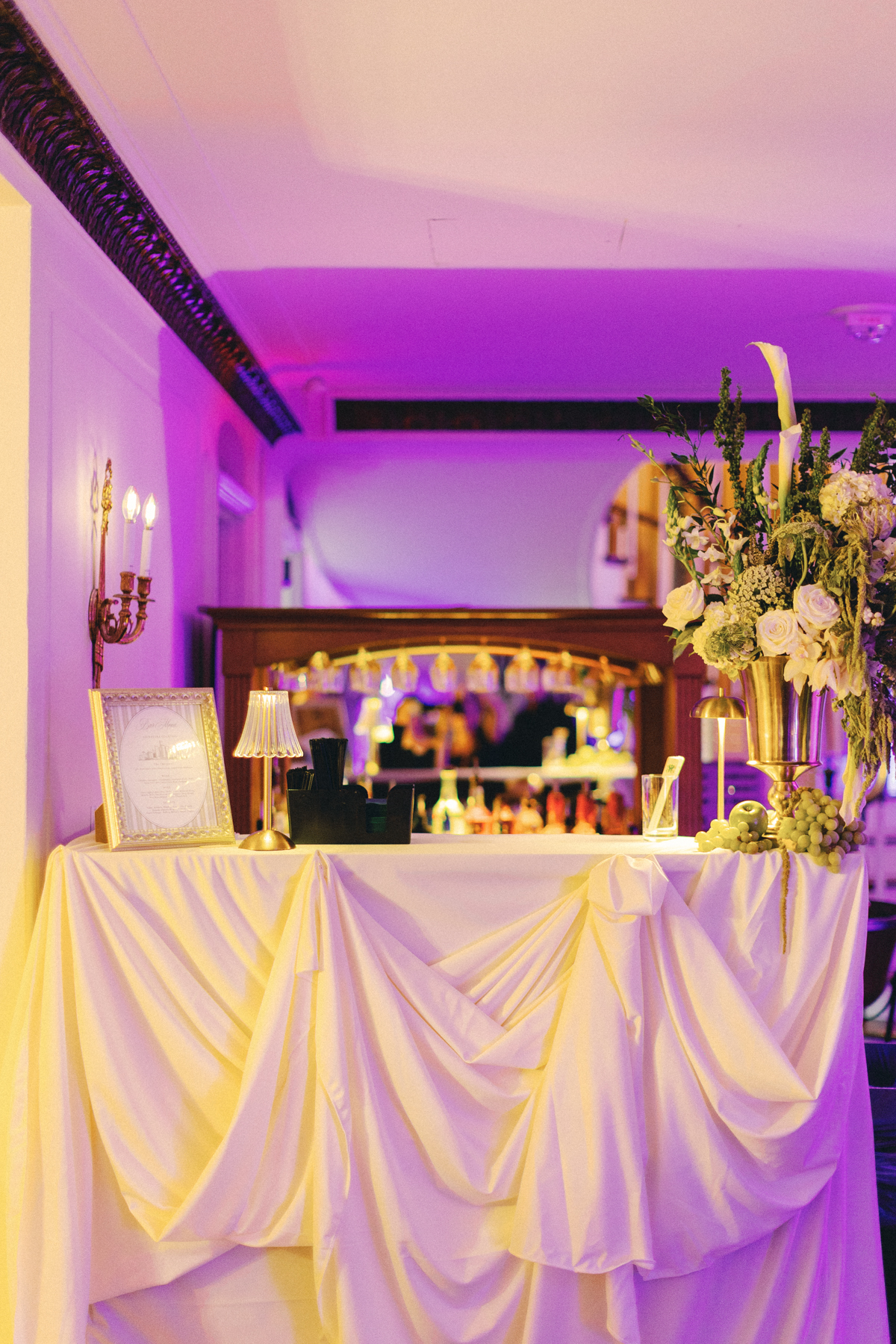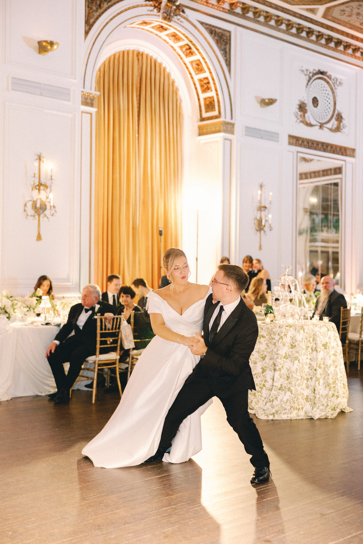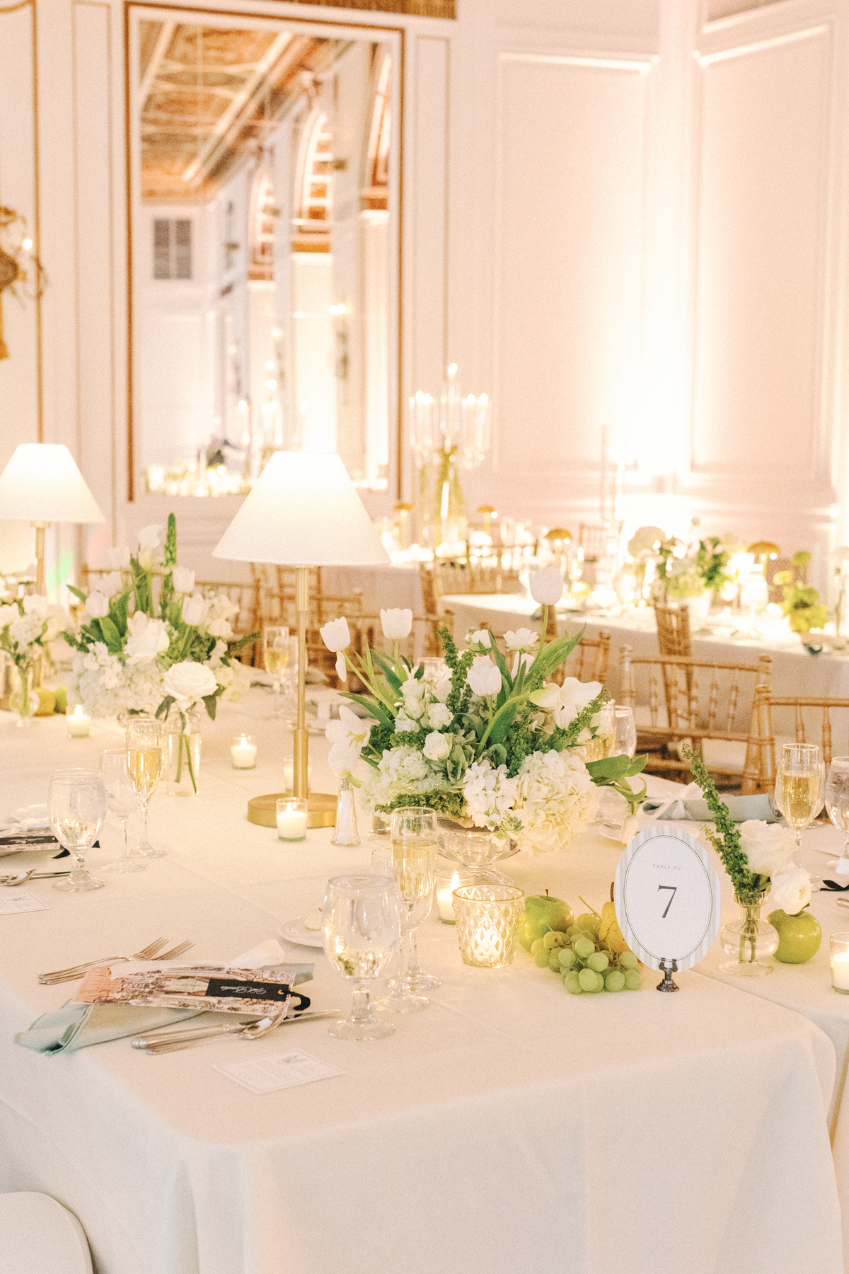 The reception at the this Colony Club Detroit wedding was the definition of timeless romance. Inside the grand ballroom, gilded chandeliers sparkled over candlelit tables draped in custom linens. Tall white-and-green floral arrangements and bud vases lined the tables, while fruit accents like pears and grapes added a European flair. Table lamps glowed softly, illuminating custom menu cards adorned with illustrations and white satin bows tied around green napkins.