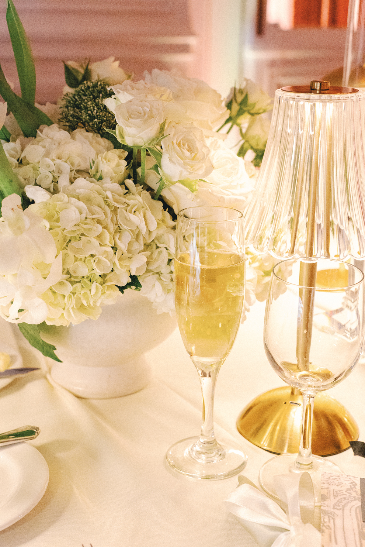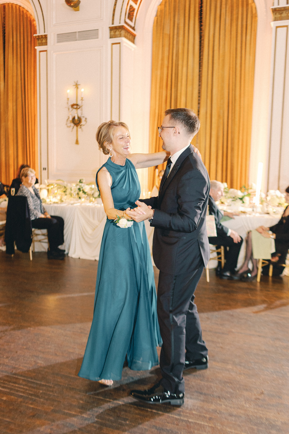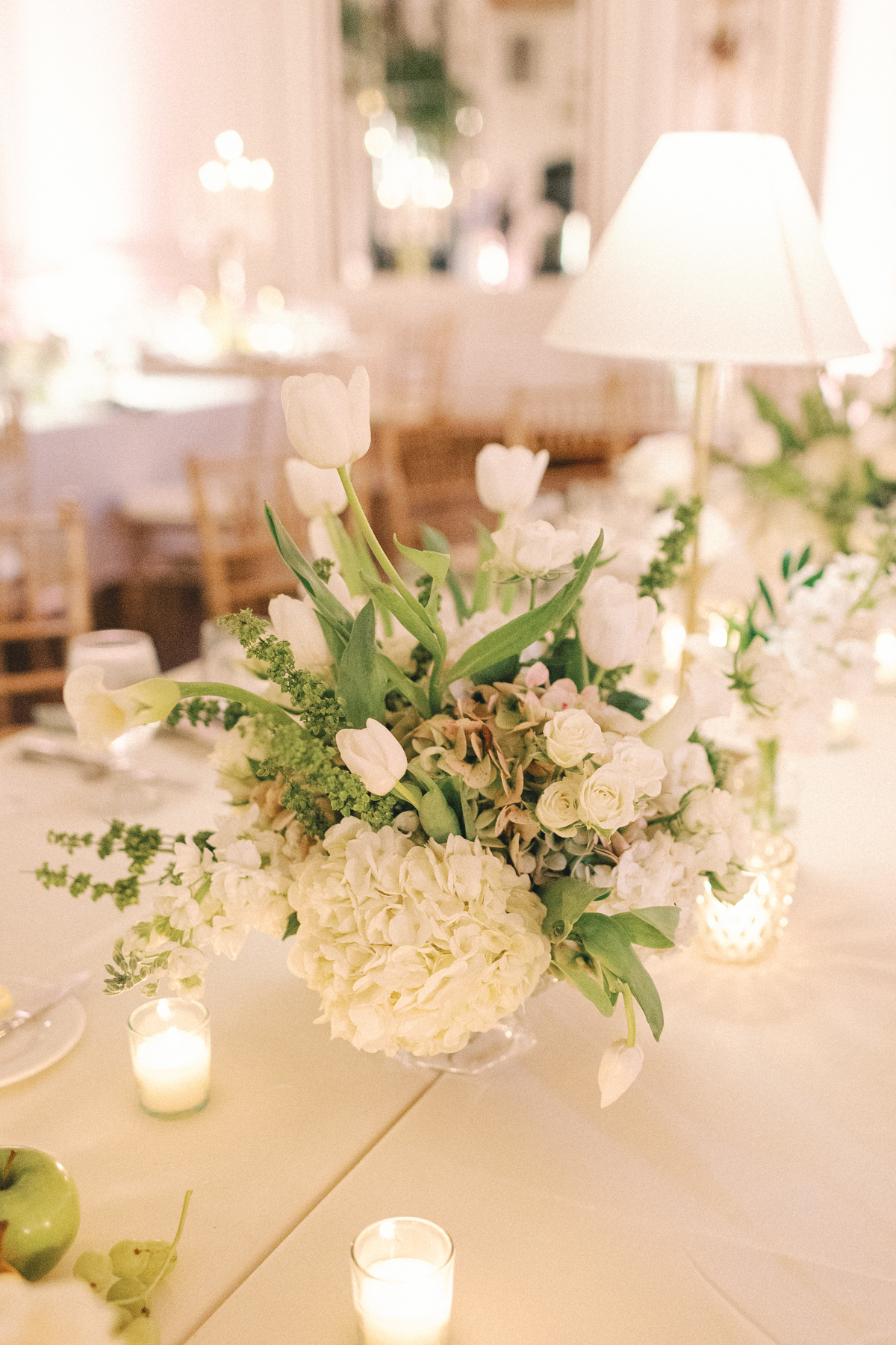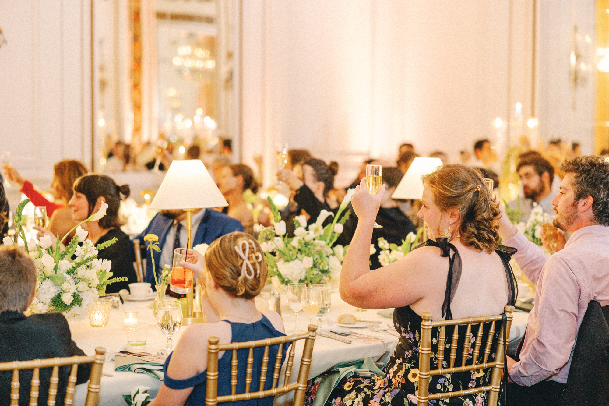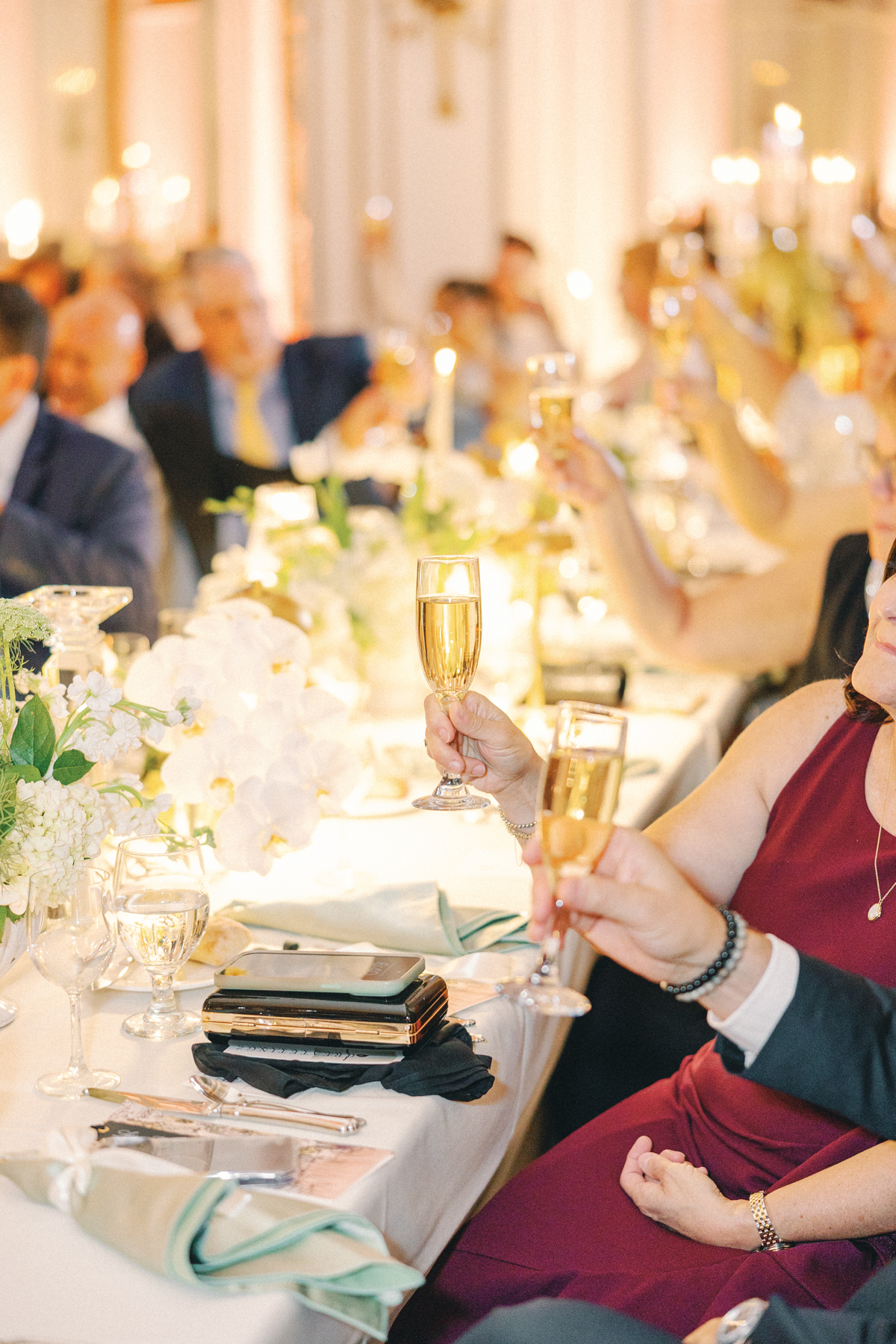 The reception at the this Colony Club Detroit wedding was the definition of timeless romance. Inside the grand ballroom, gilded chandeliers sparkled over candlelit tables draped in custom linens. Tall white-and-green floral arrangements and bud vases lined the tables, while fruit accents like pears and grapes added a European flair. Table lamps glowed softly, illuminating custom menu cards adorned with illustrations and white satin bows tied around green napkins.