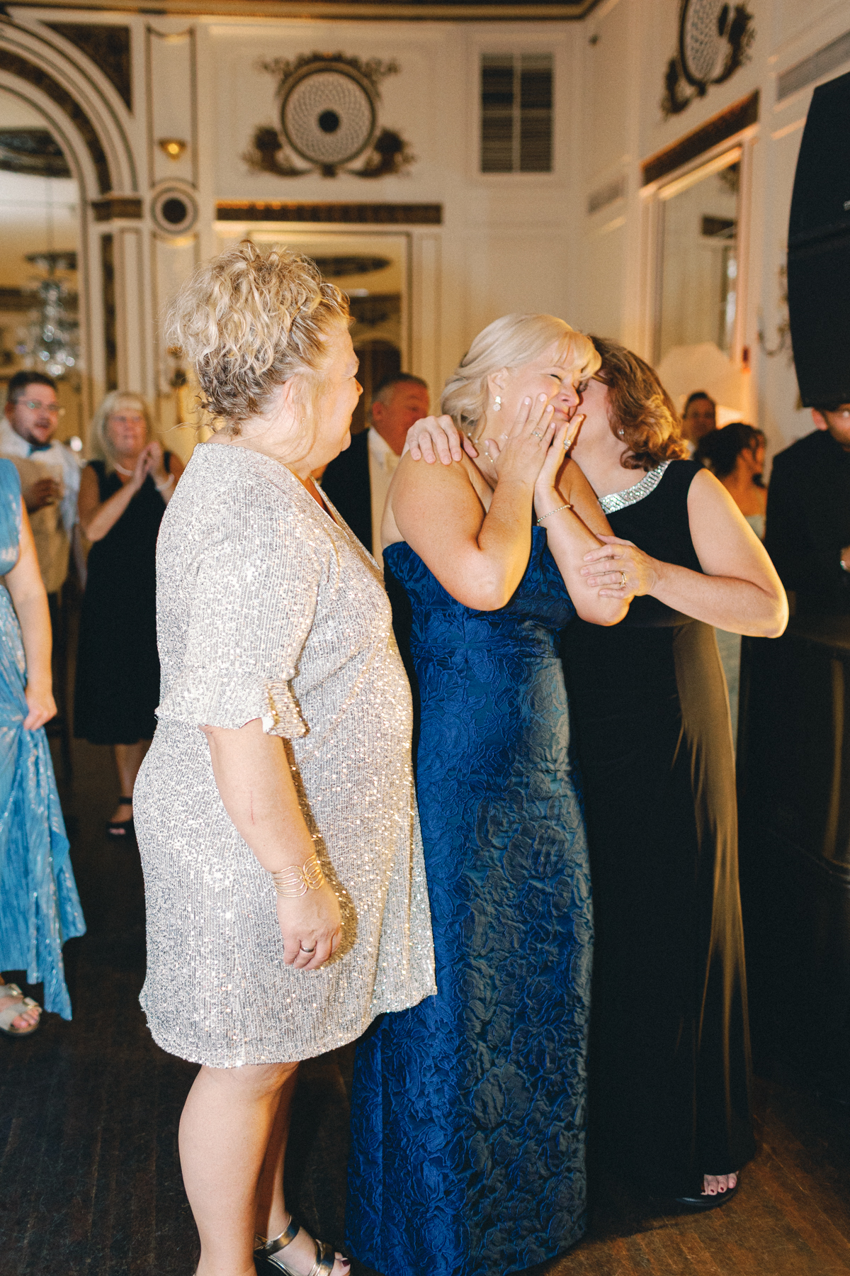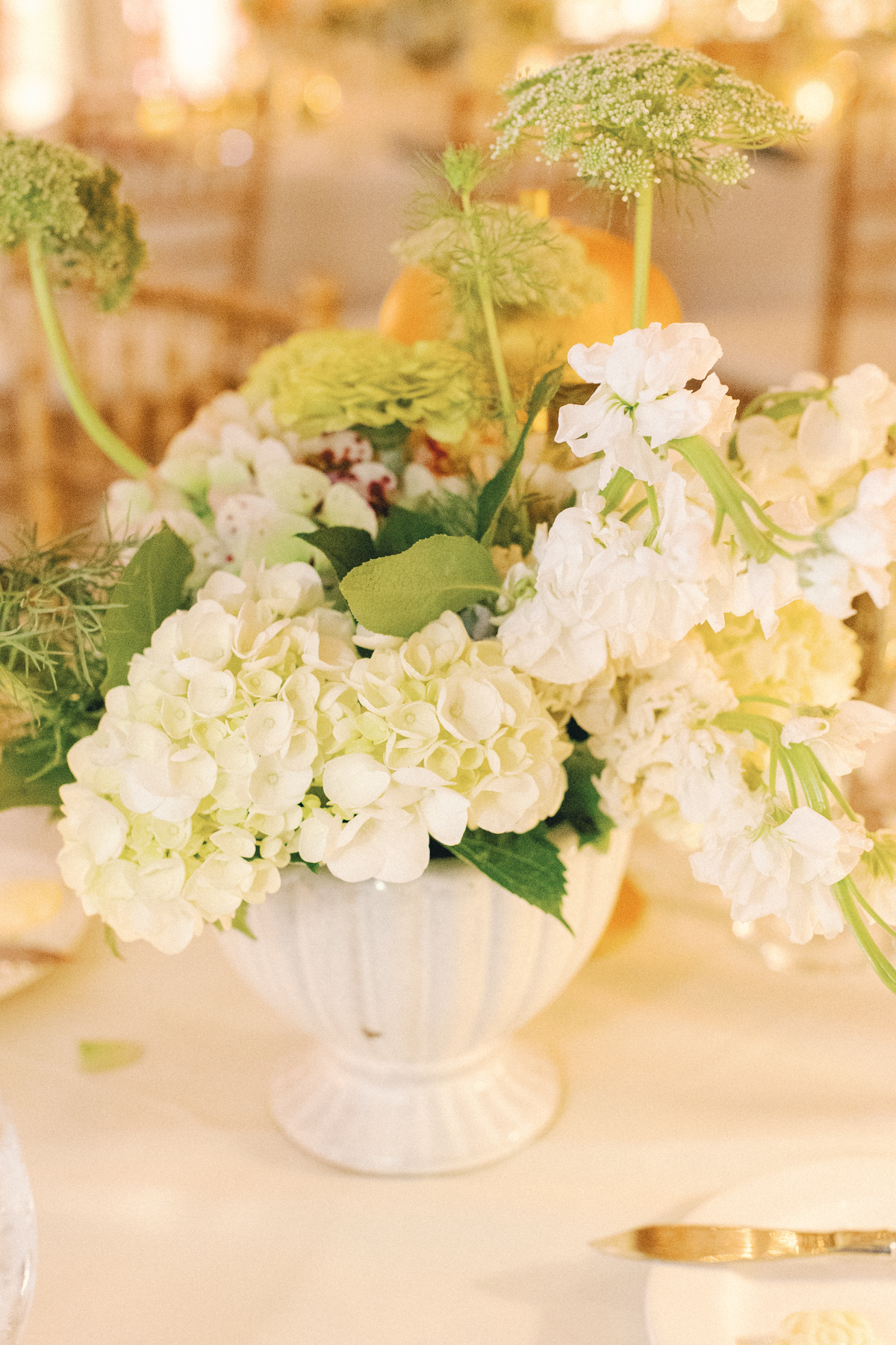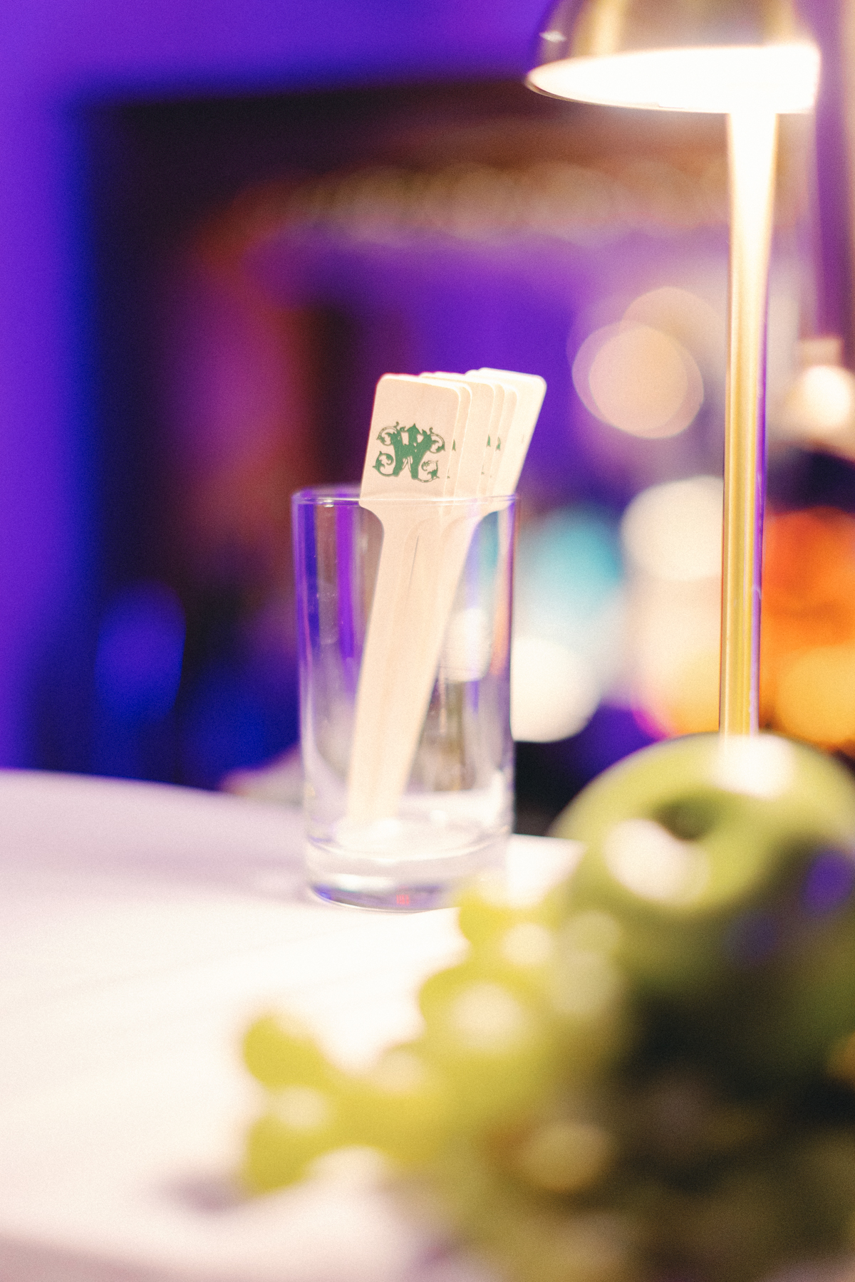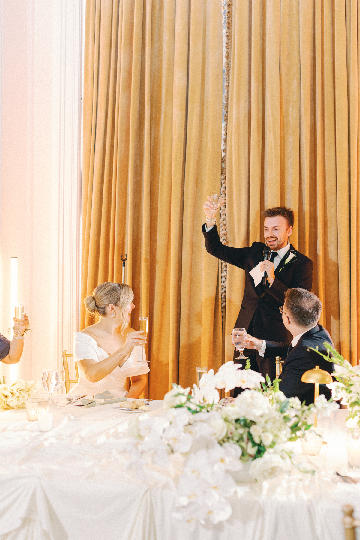 The reception at the this Colony Club Detroit wedding was the definition of timeless romance. Inside the grand ballroom, gilded chandeliers sparkled over candlelit tables draped in custom linens. Tall white-and-green floral arrangements and bud vases lined the tables, while fruit accents like pears and grapes added a European flair. Table lamps glowed softly, illuminating custom menu cards adorned with illustrations and white satin bows tied around green napkins.