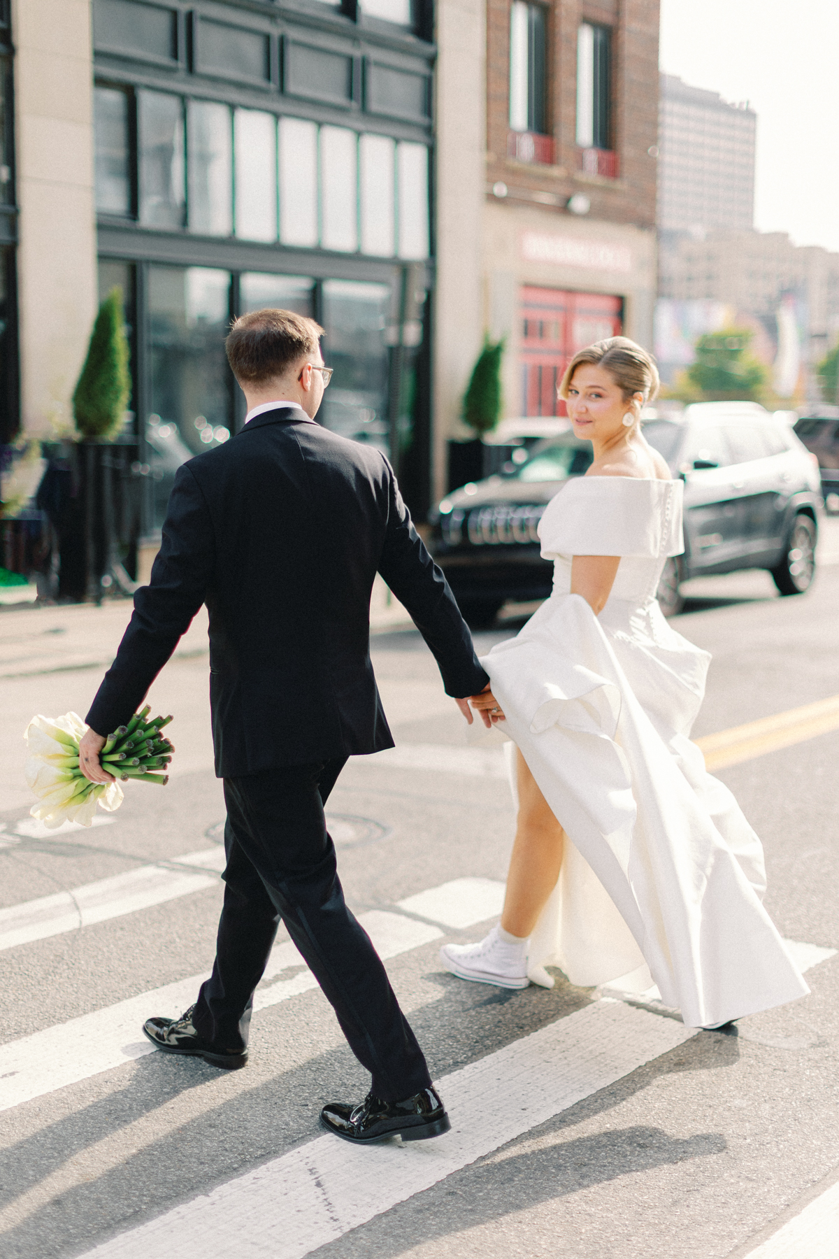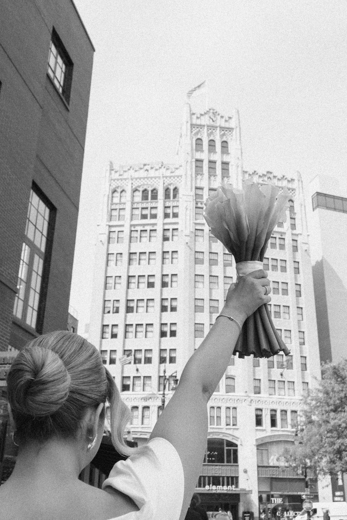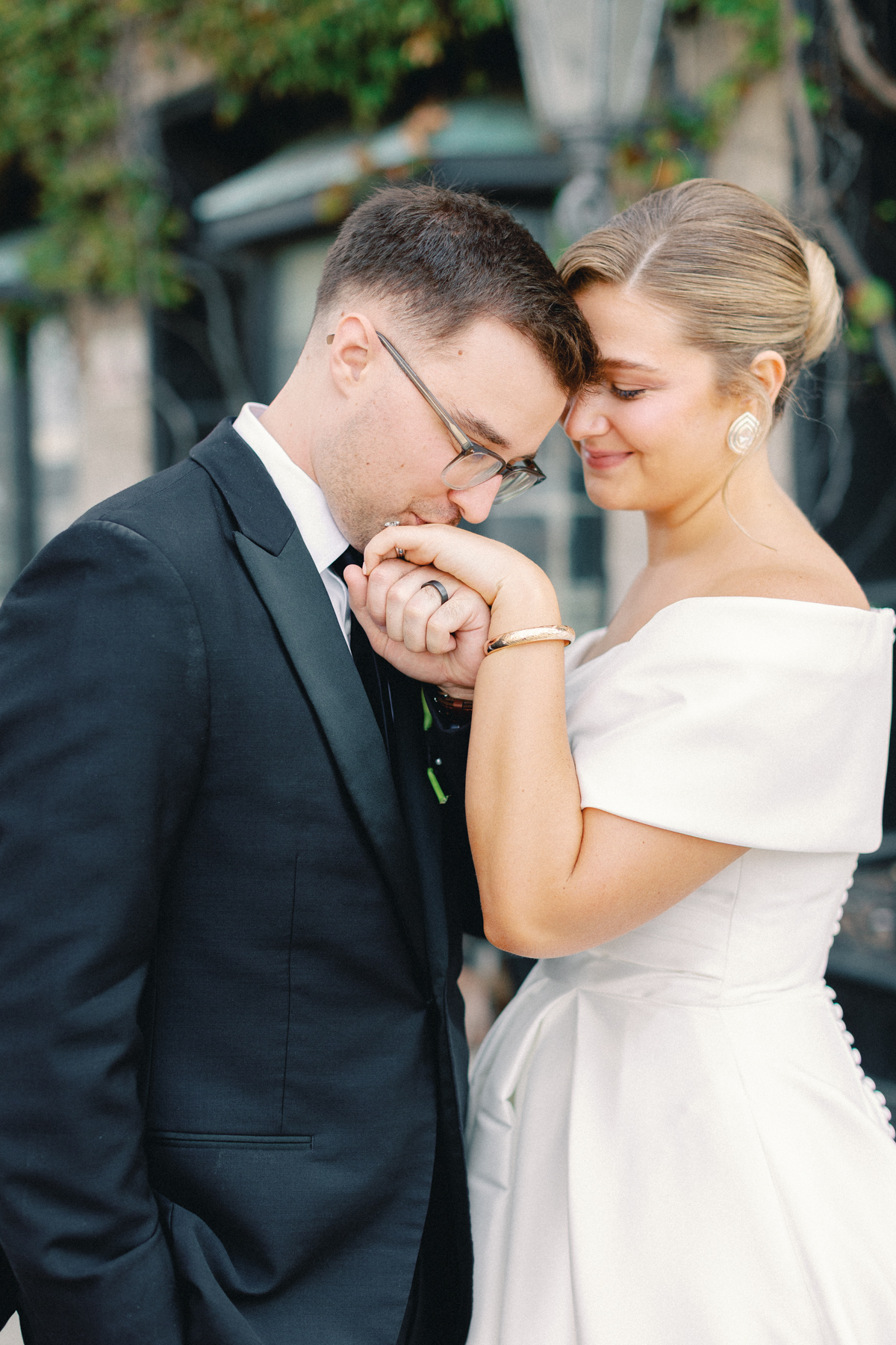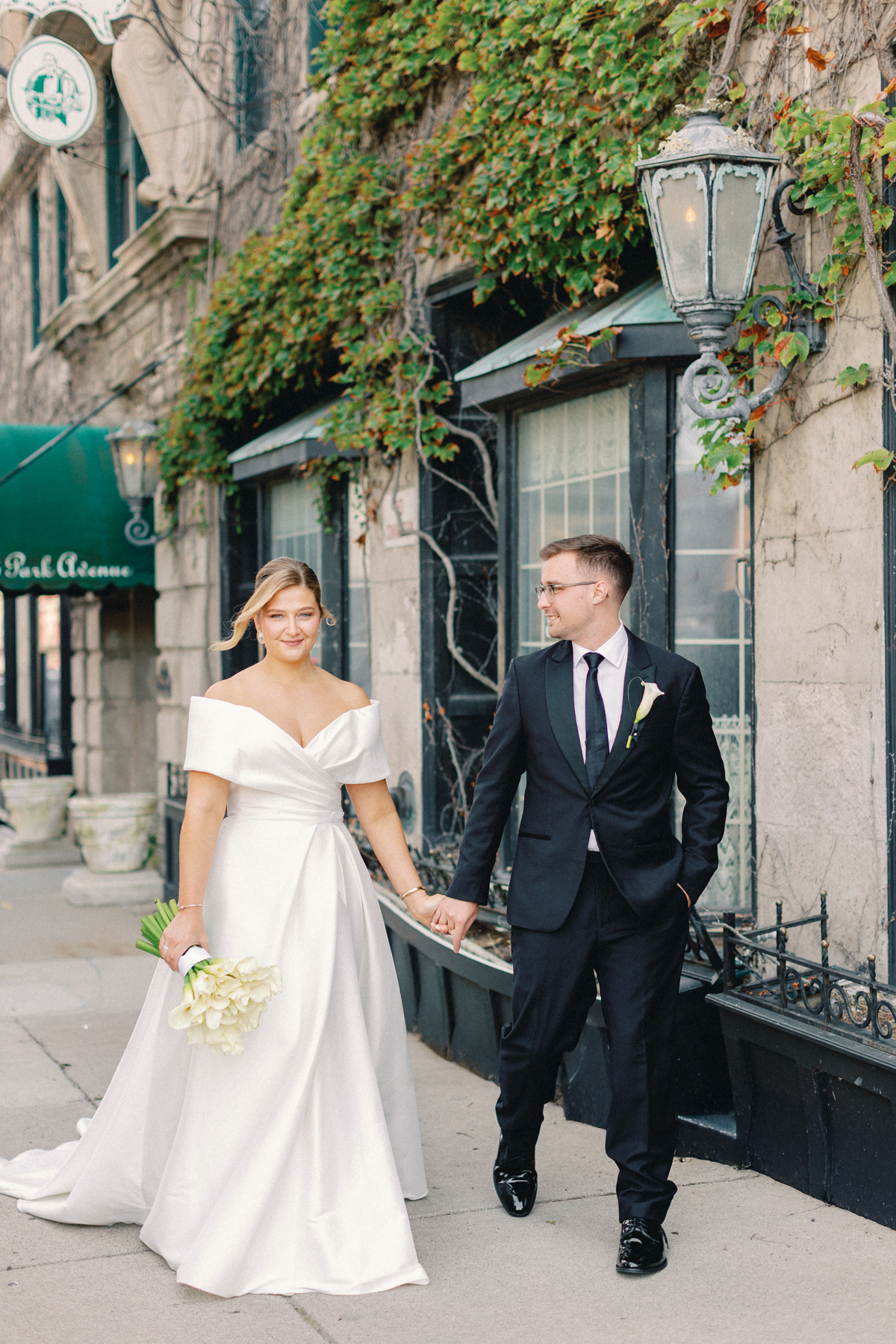 After a private first look in Ashbar, David and Melissa headed out for portraits in the Siren Hotel garden, Shinola Alley and across the city streets. The black, white, and green palette of their wedding style perfectly contrasted against Detroit’s industrial architecture, adding an editorial edge to their portraits.