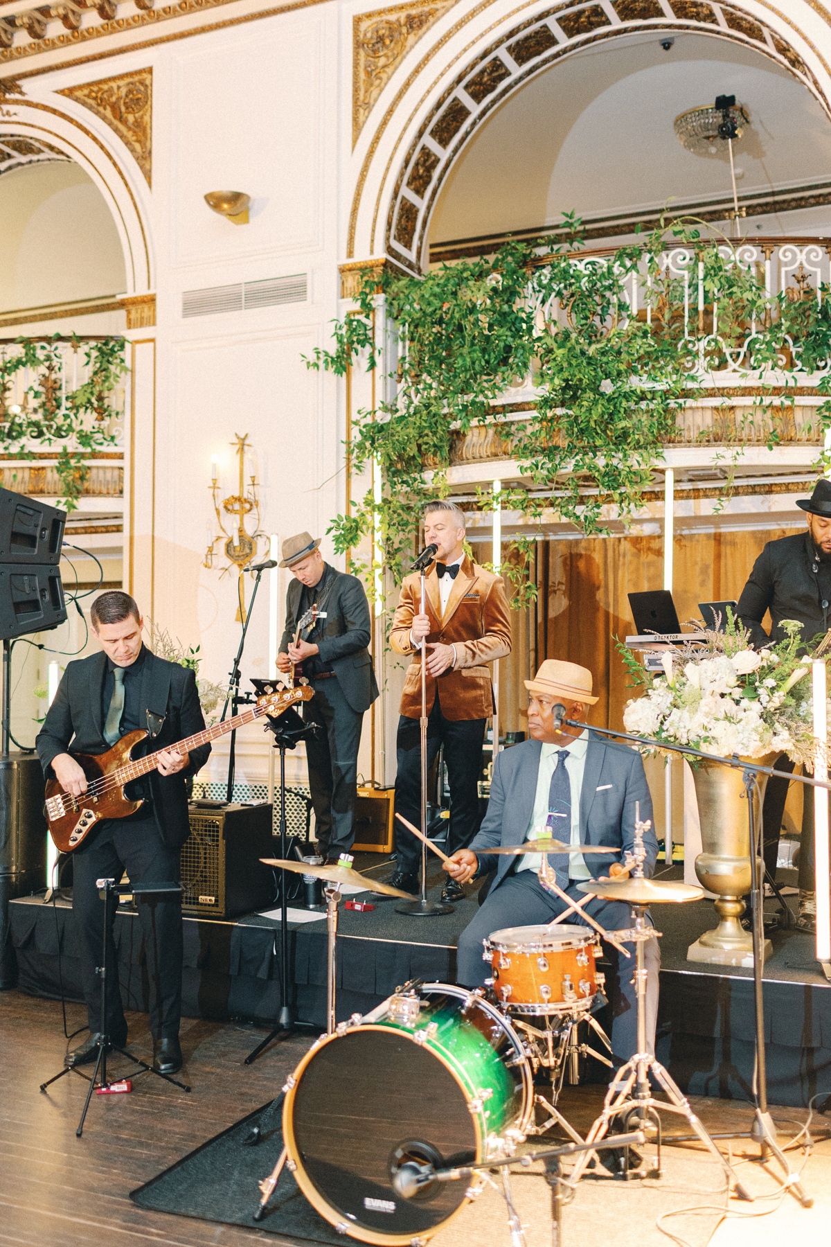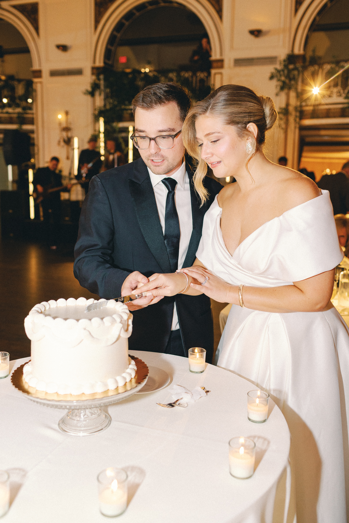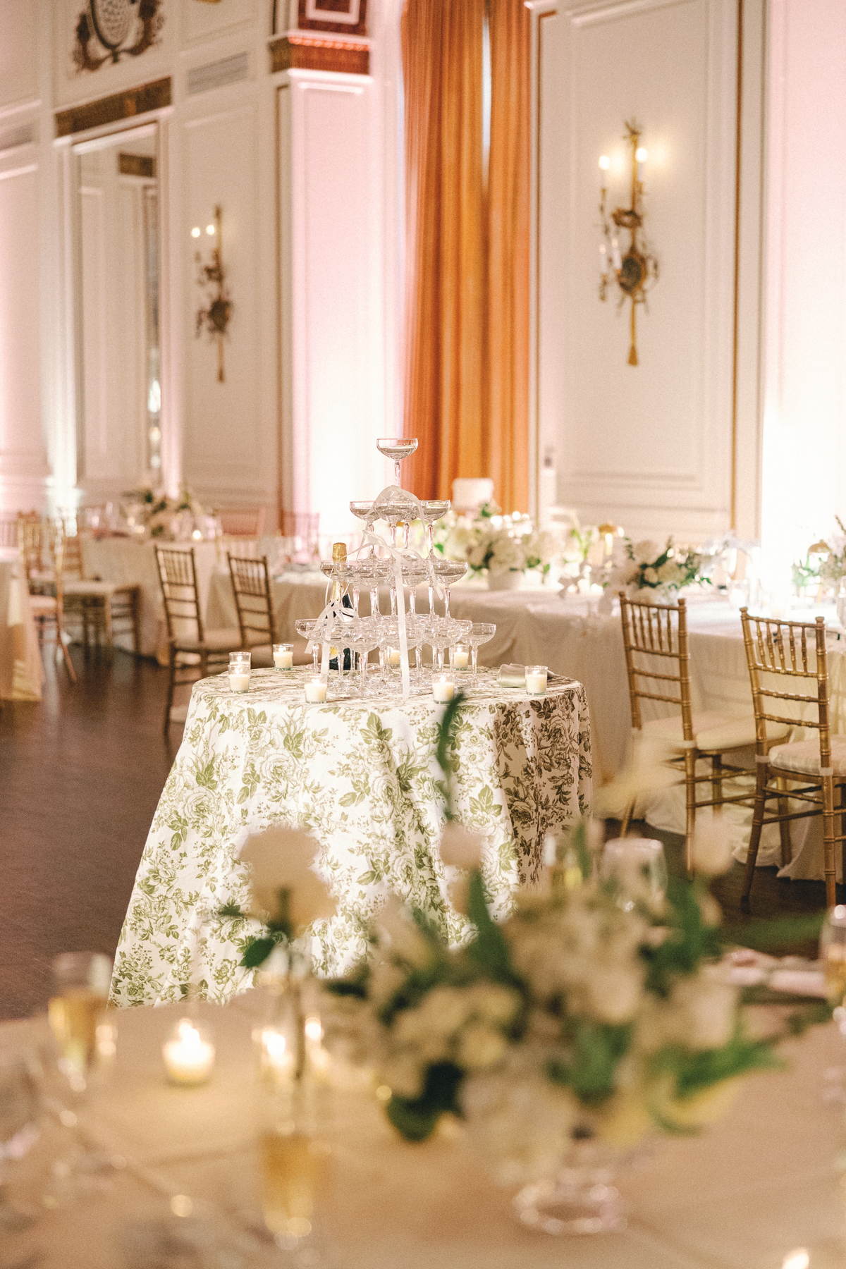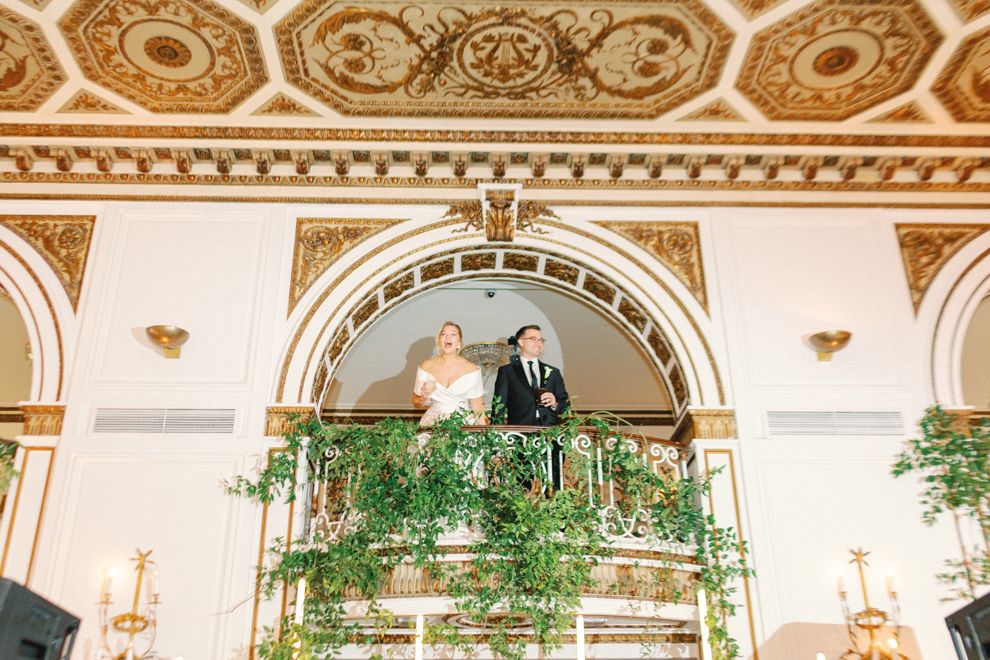 Melissa and David shared their first dance to Can’t Take My Eyes Off of You by Frankie Valli, while an all-Motown cocktail hour playlist and live performances by Ben Sharkey and The Elysium Experience carried Detroit’s soulful energy into the evening. A champagne tower dressed with delicate bows added a playful touch, while greenery cascaded from the balconies where the couple made their room reveal.