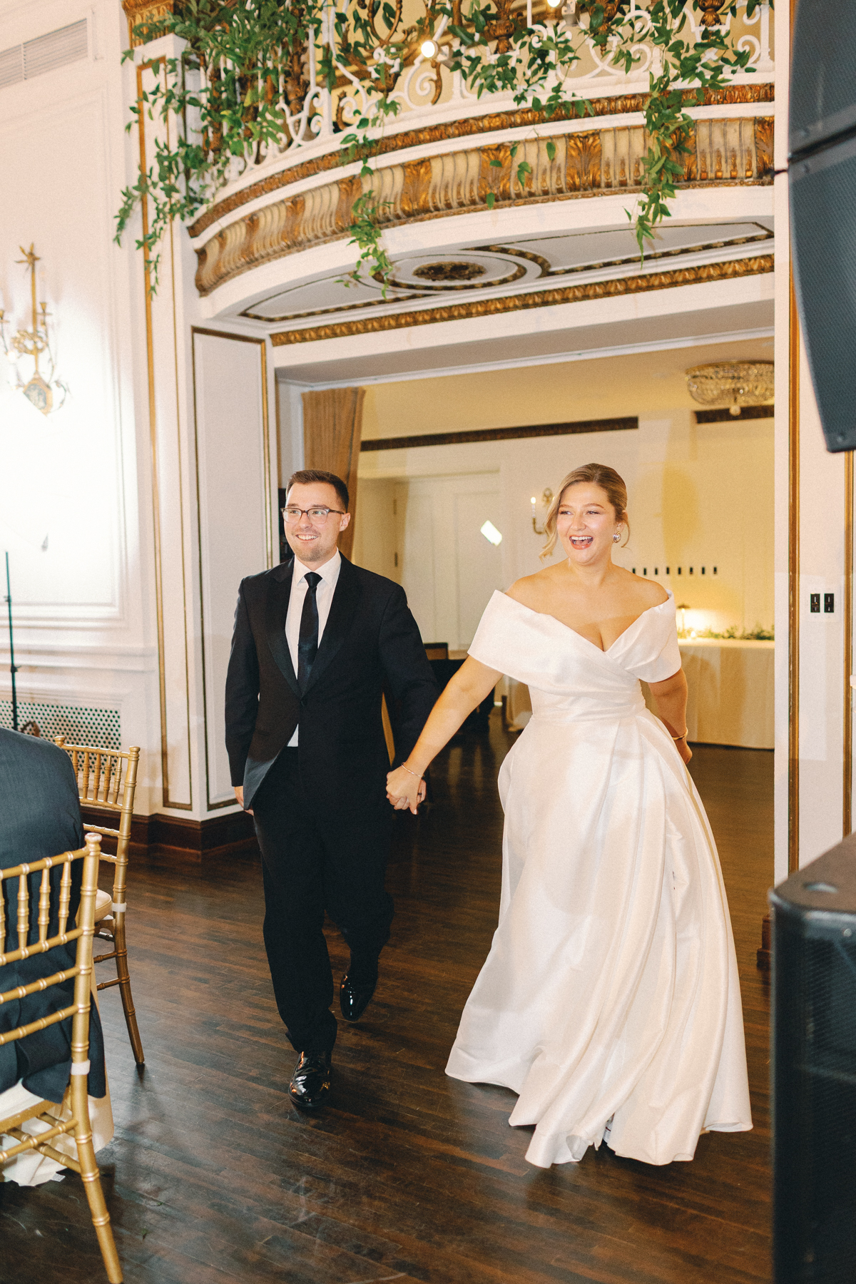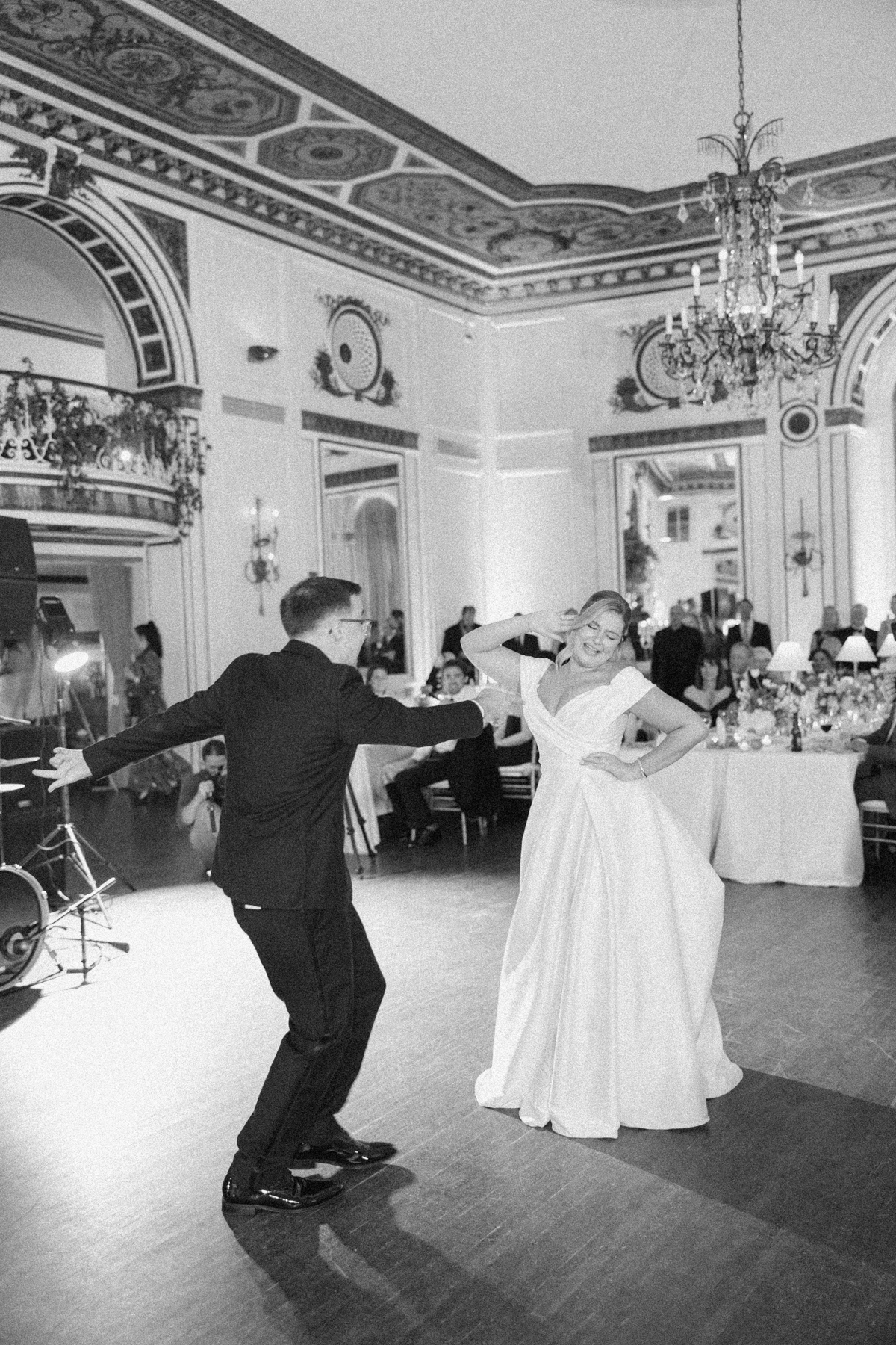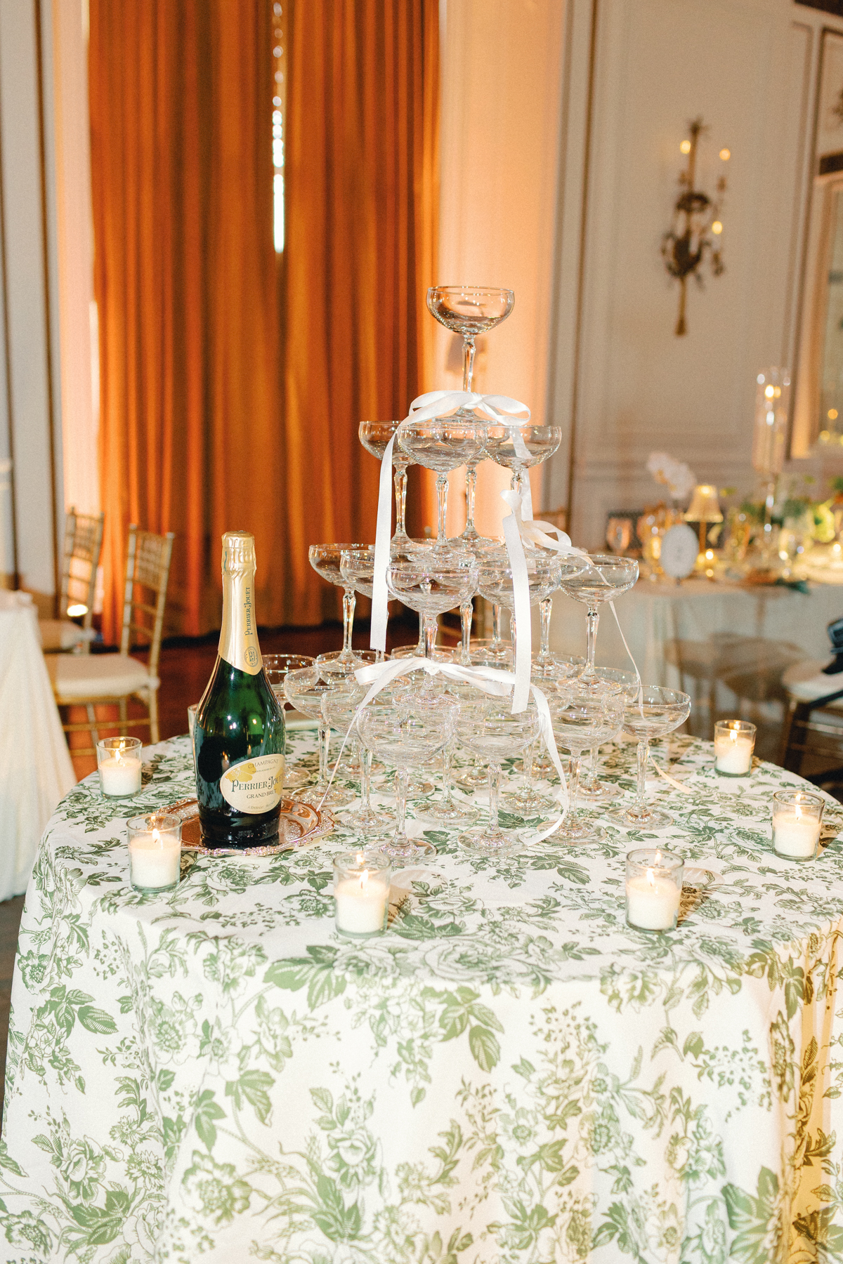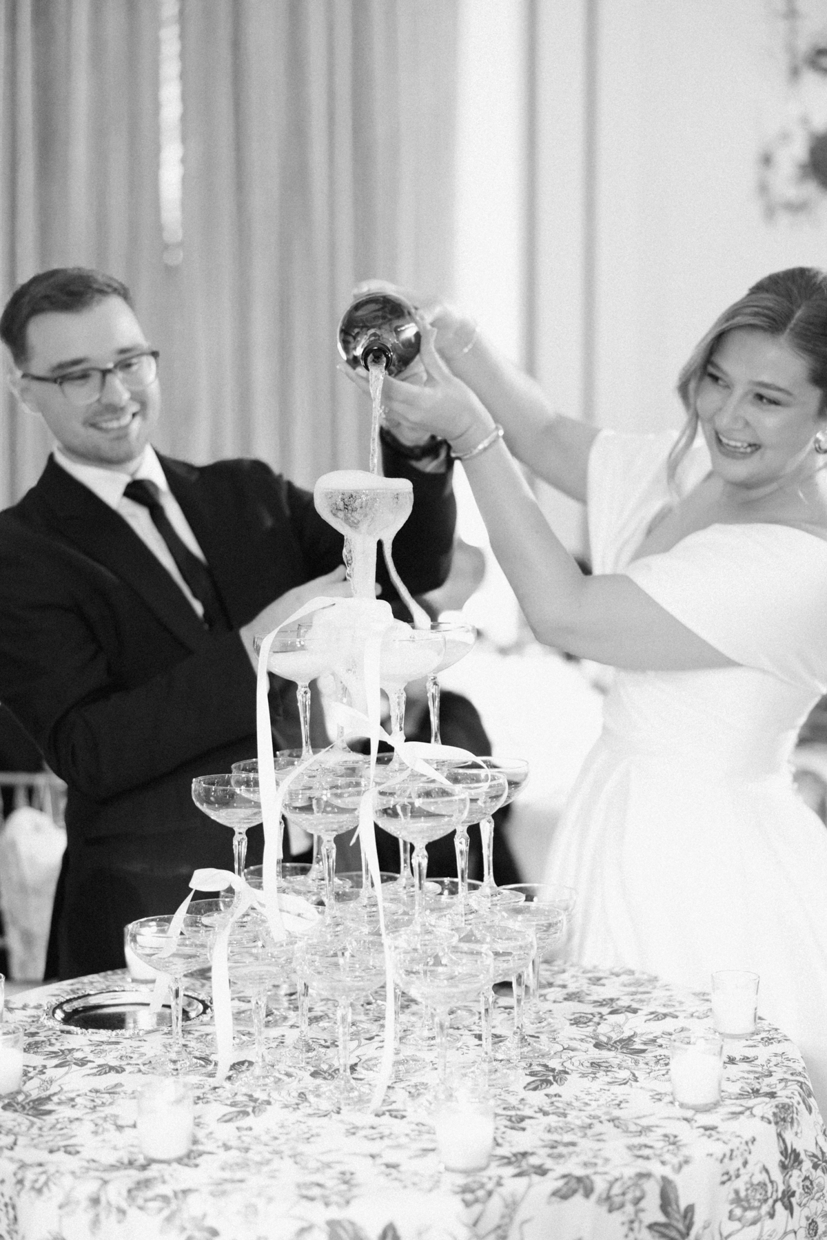 Melissa and David shared their first dance to Can’t Take My Eyes Off of You by Frankie Valli, while an all-Motown cocktail hour playlist and live performances by Ben Sharkey and The Elysium Experience carried Detroit’s soulful energy into the evening. A champagne tower dressed with delicate bows added a playful touch, while greenery cascaded from the balconies where the couple made their room reveal.
