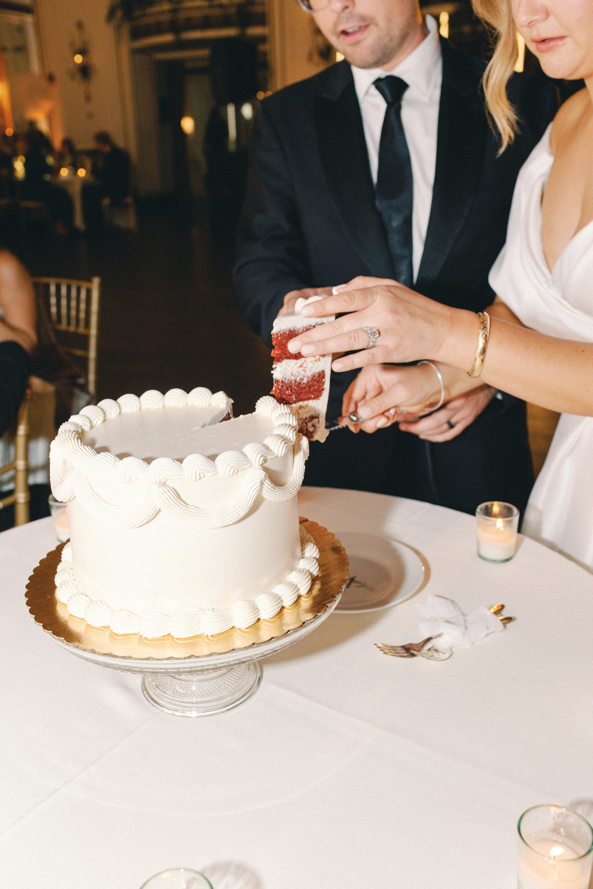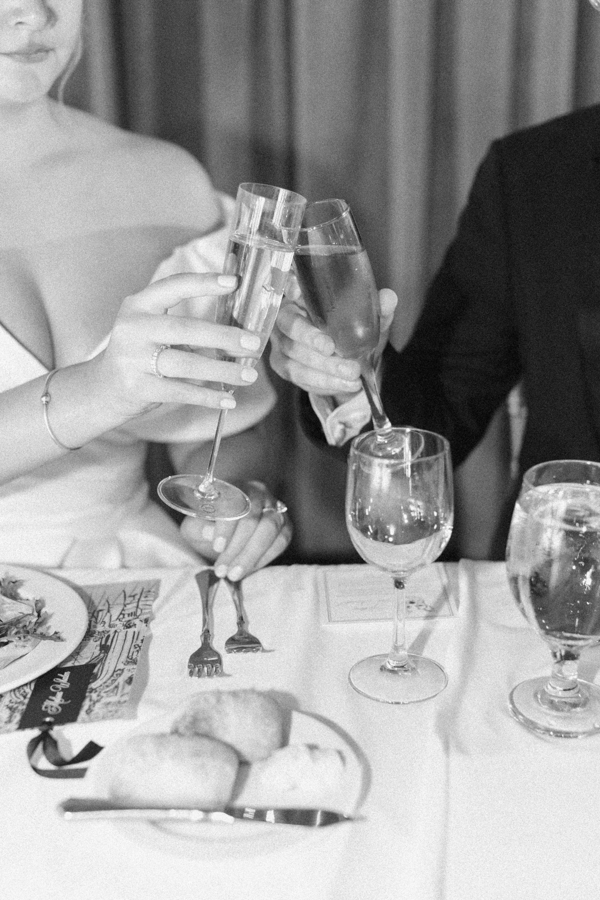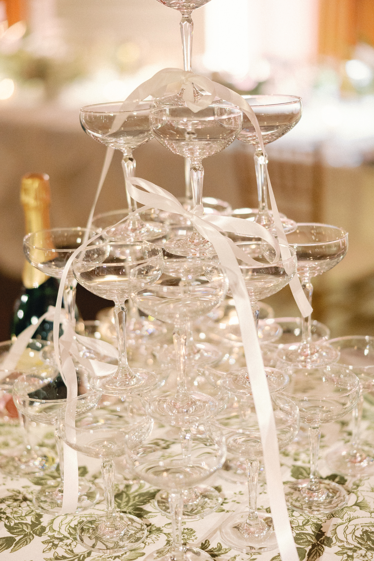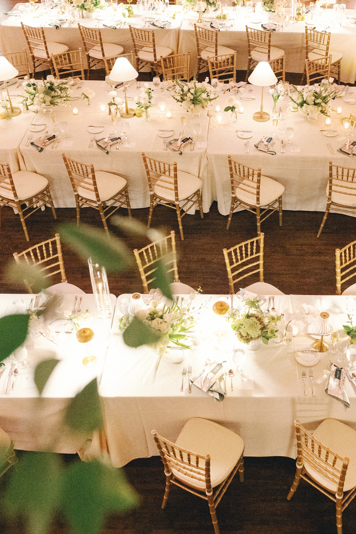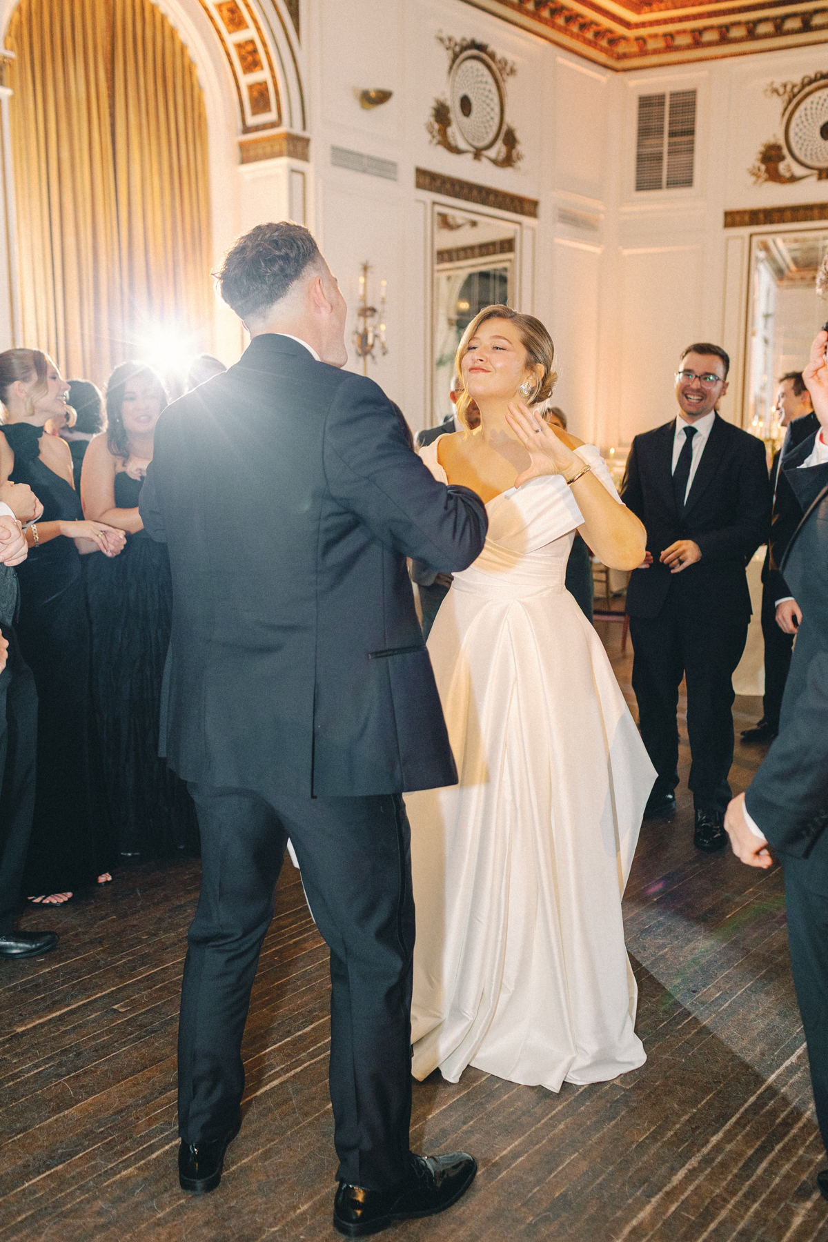 Melissa and David shared their first dance to Can’t Take My Eyes Off of You by Frankie Valli, while an all-Motown cocktail hour playlist and live performances by Ben Sharkey and The Elysium Experience carried Detroit’s soulful energy into the evening. A champagne tower dressed with delicate bows added a playful touch, while greenery cascaded from the balconies where the couple made their room reveal.