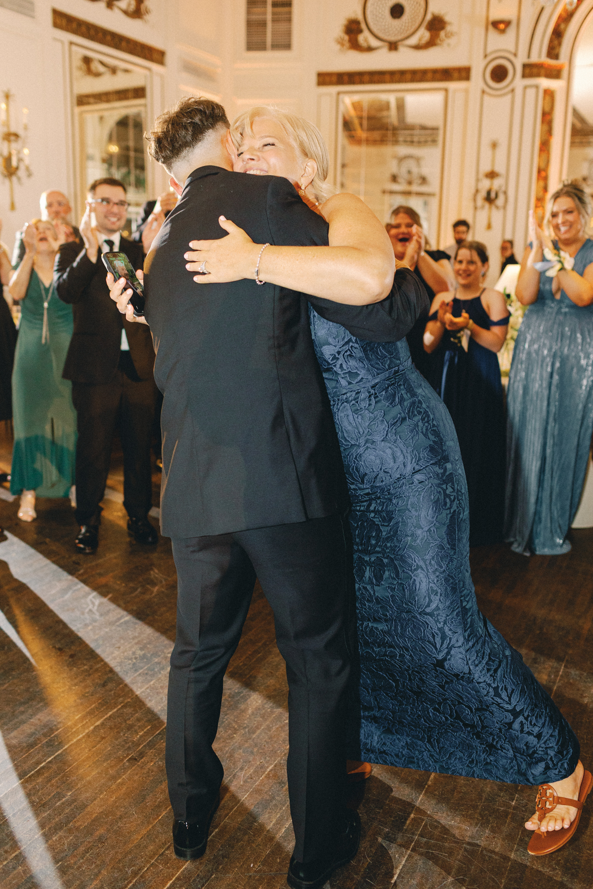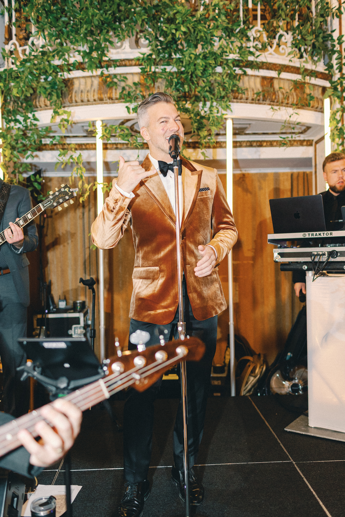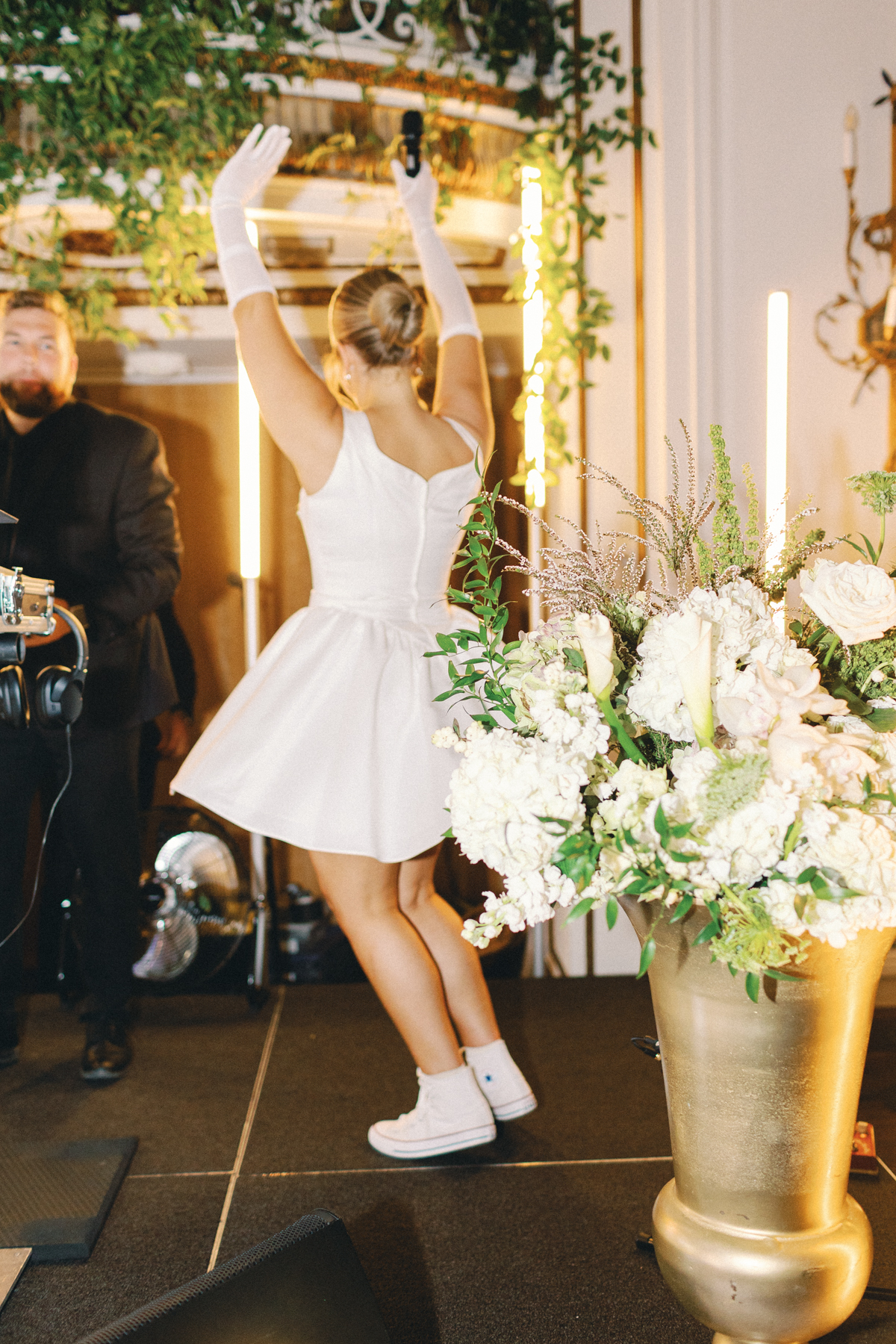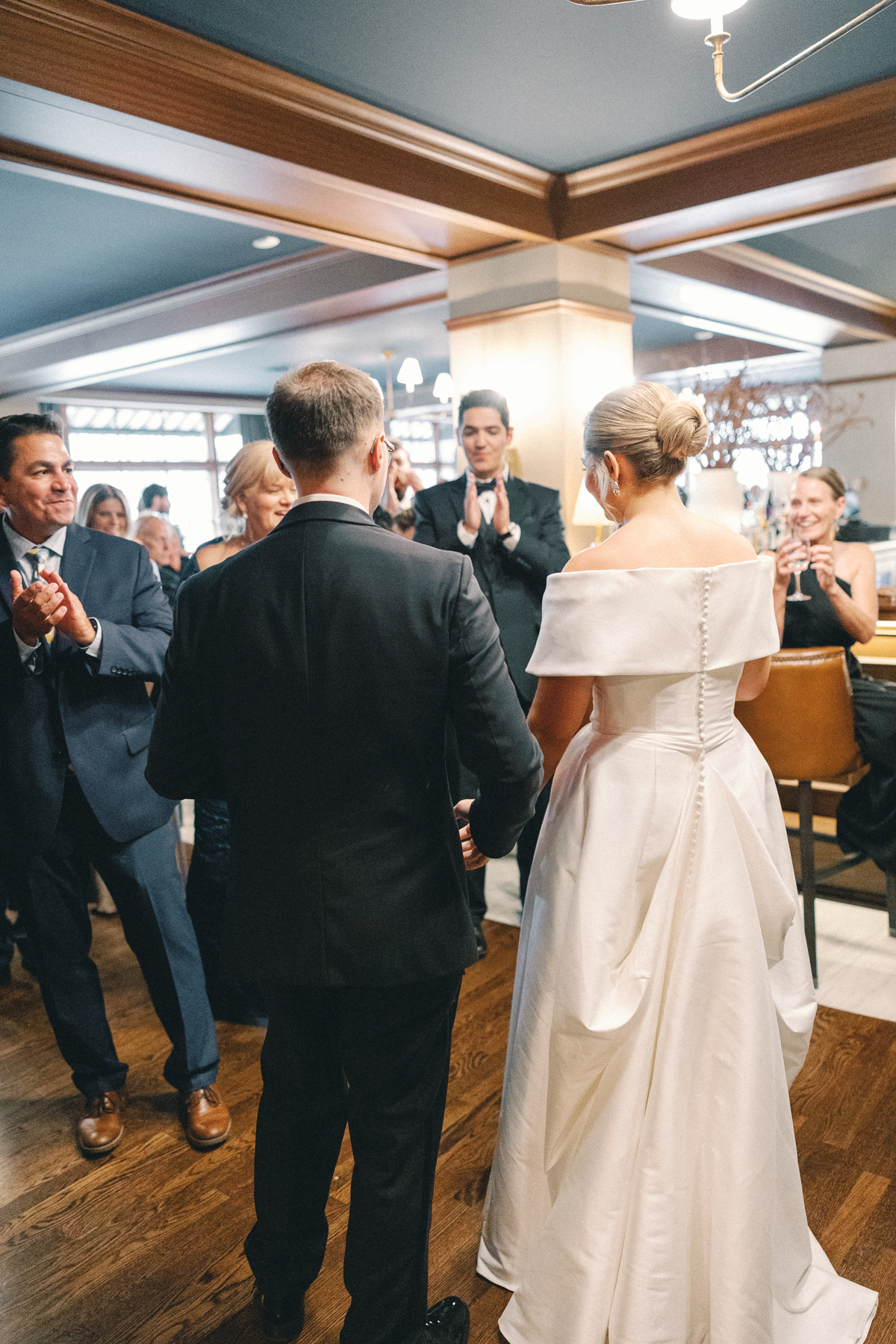 Melissa and David shared their first dance to Can’t Take My Eyes Off of You by Frankie Valli, while an all-Motown cocktail hour playlist and live performances by Ben Sharkey and The Elysium Experience carried Detroit’s soulful energy into the evening. A champagne tower dressed with delicate bows added a playful touch, while greenery cascaded from the balconies where the couple made their room reveal.