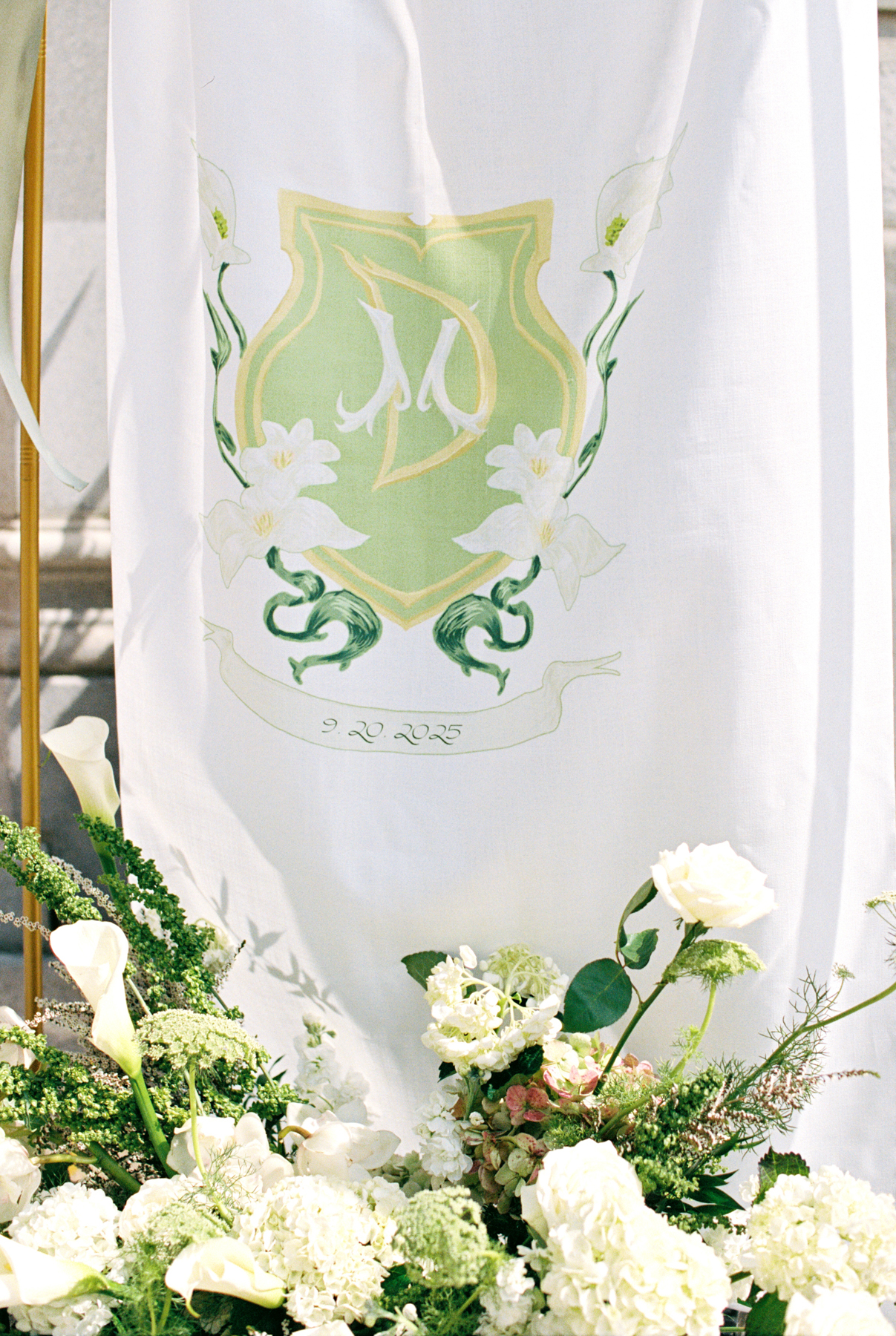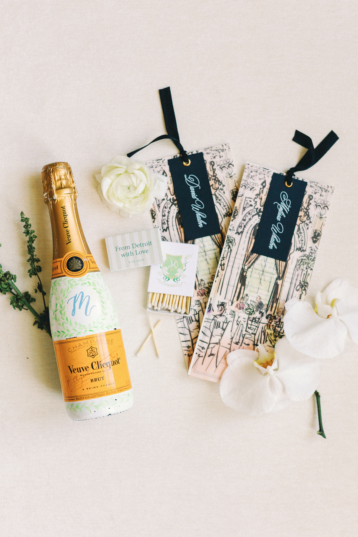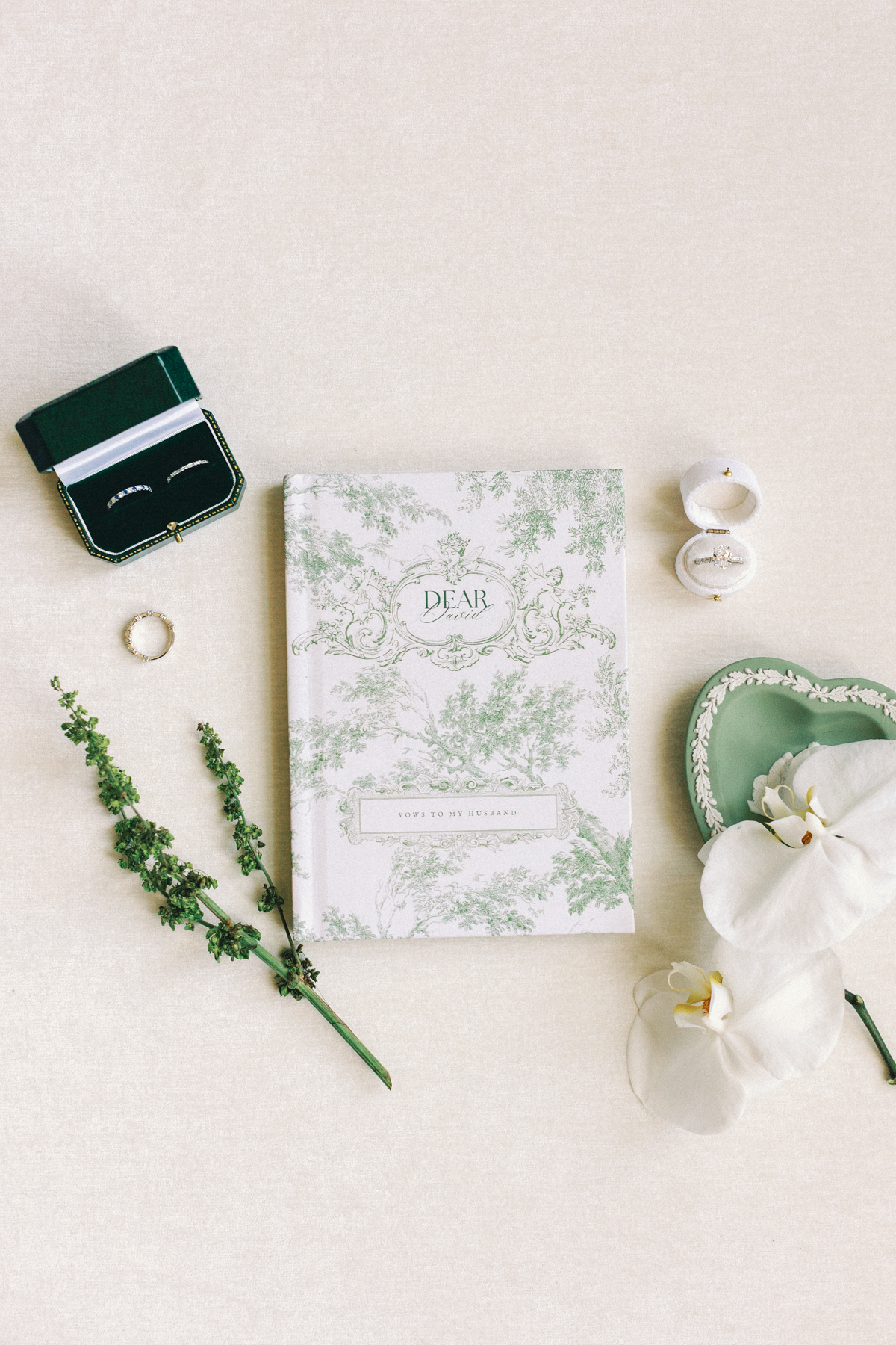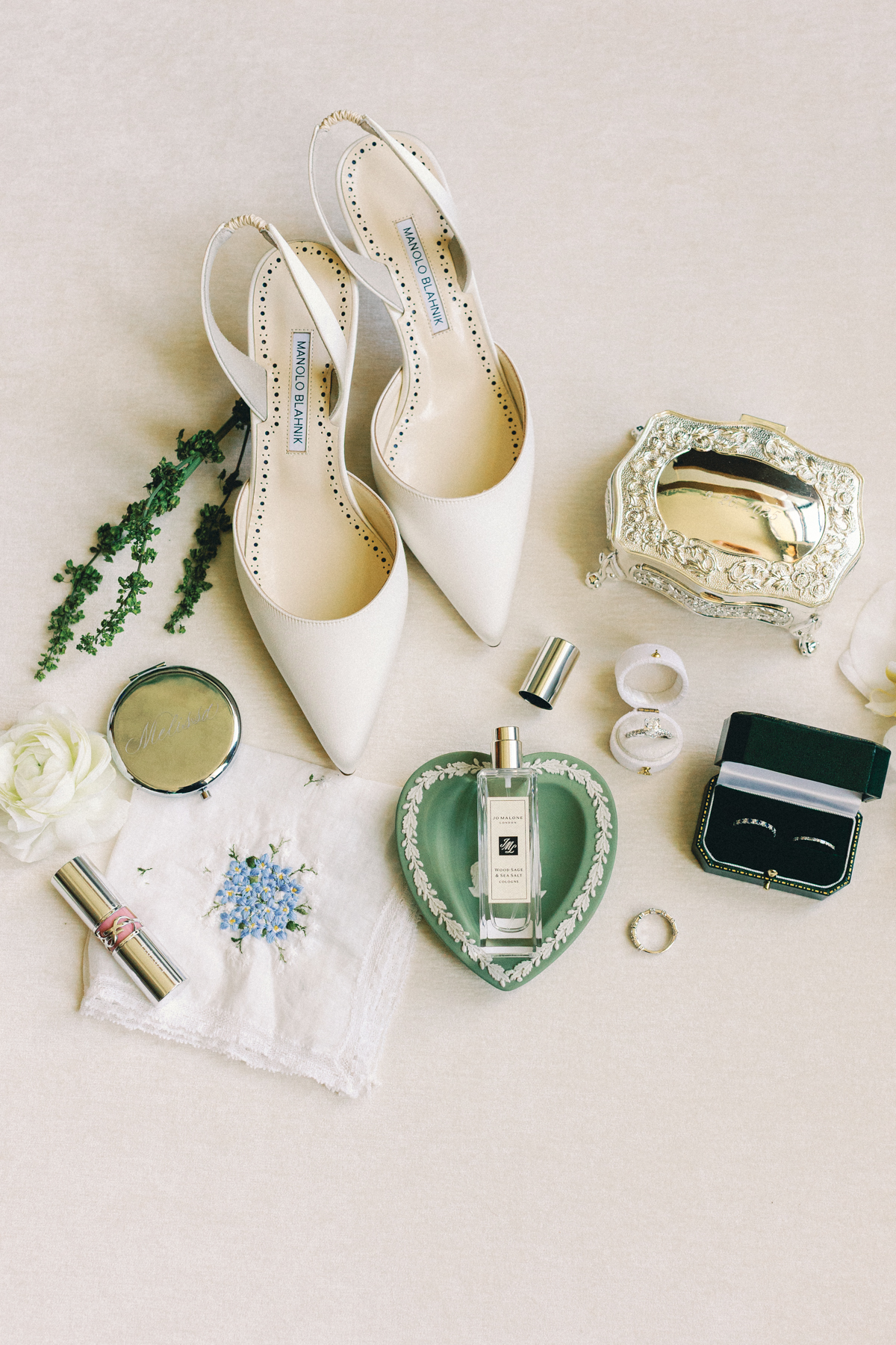 Flatlay details included a custom invitation suite with an illustrated envelope liner, a monogram design carried throughout the day (even featured on a cloth drop welcome sign and cocktail napkins), and heirloom-inspired touches that reflected their thoughtful, elegant style.