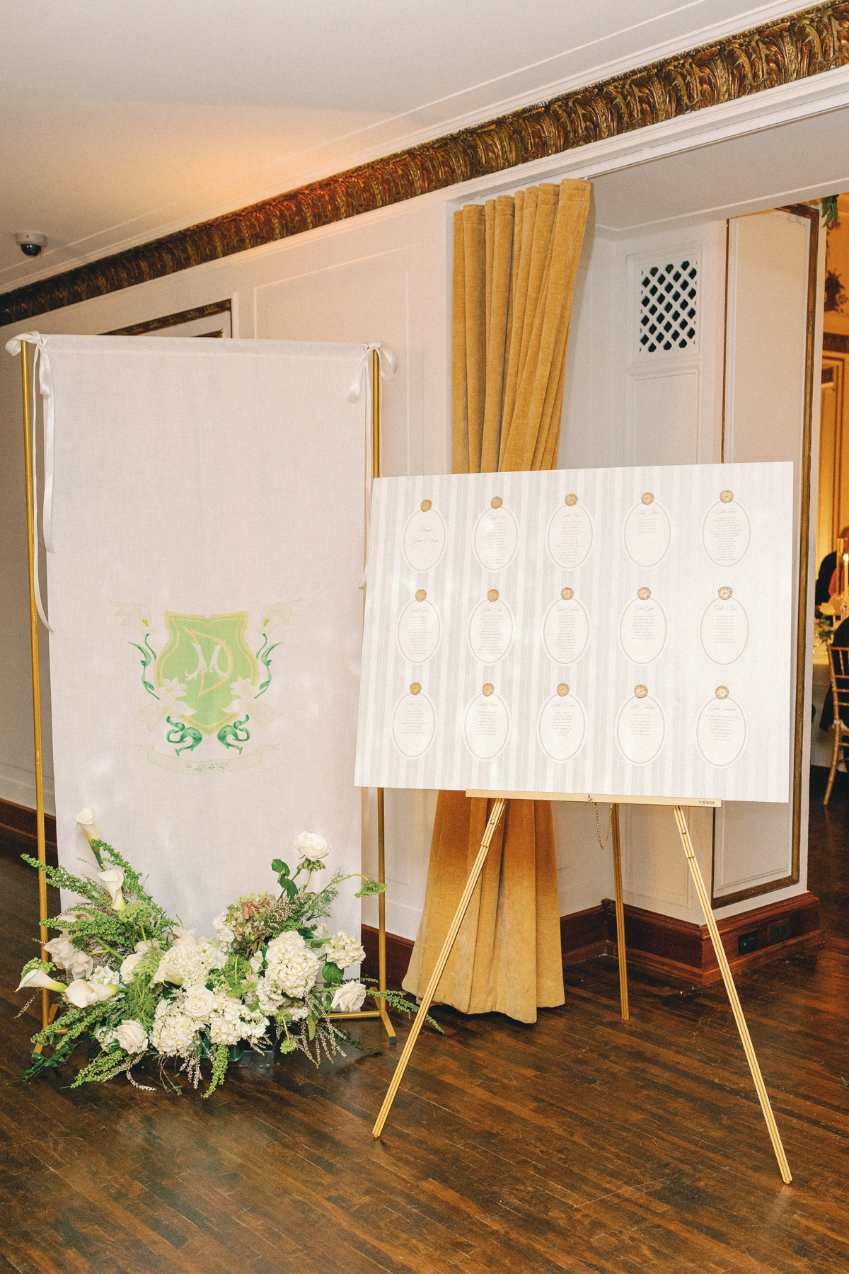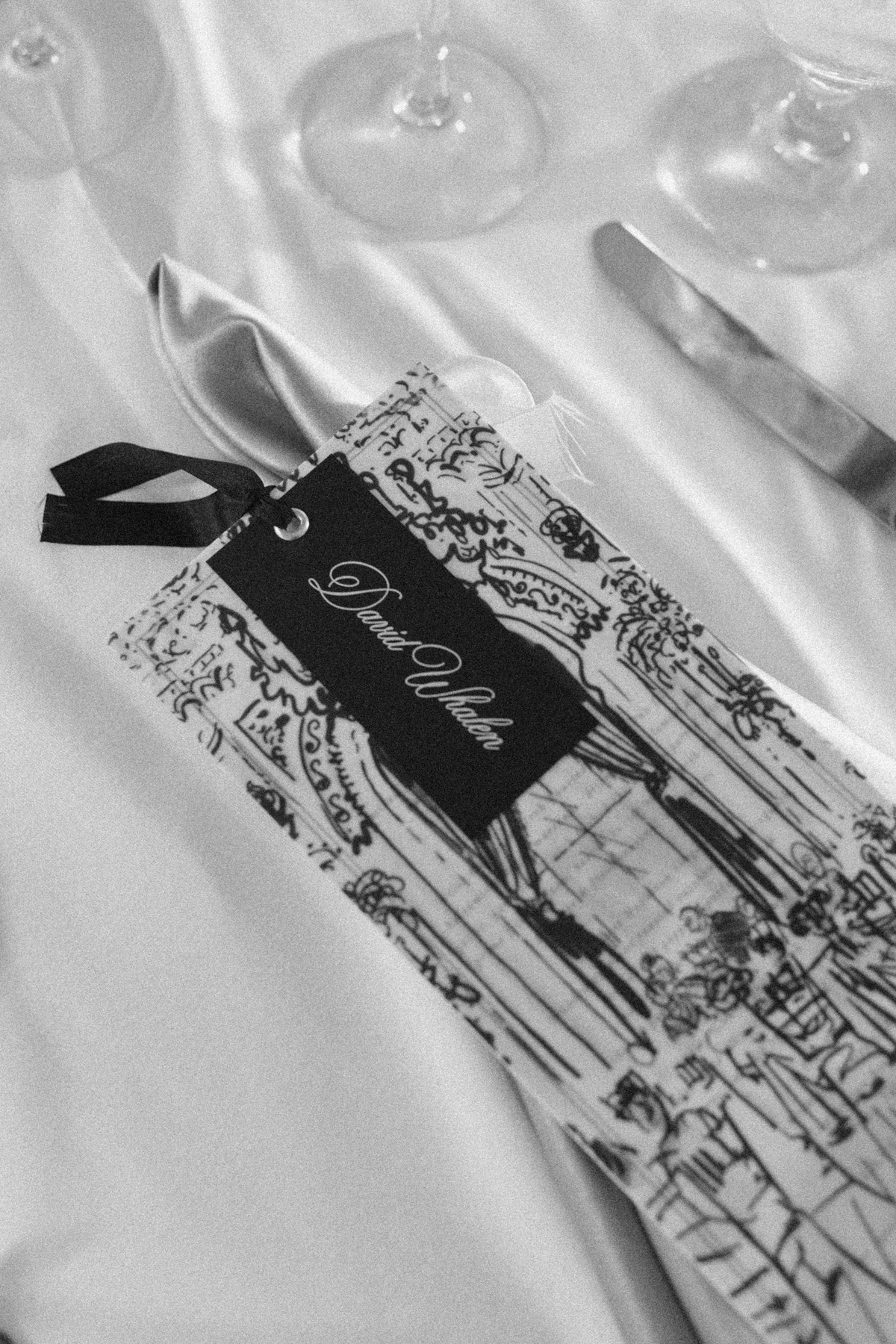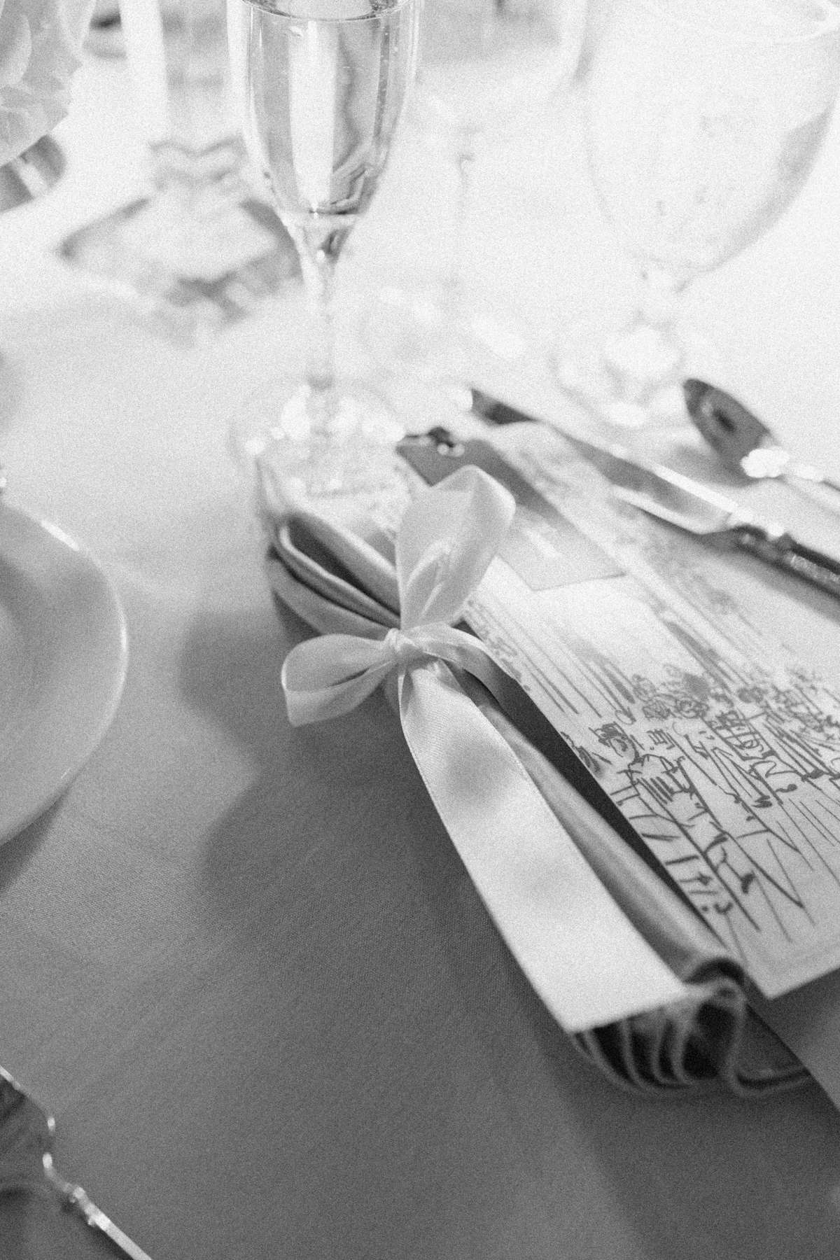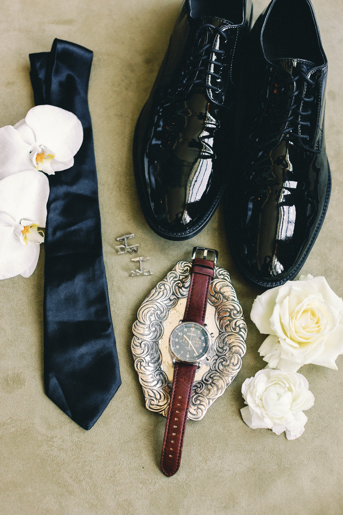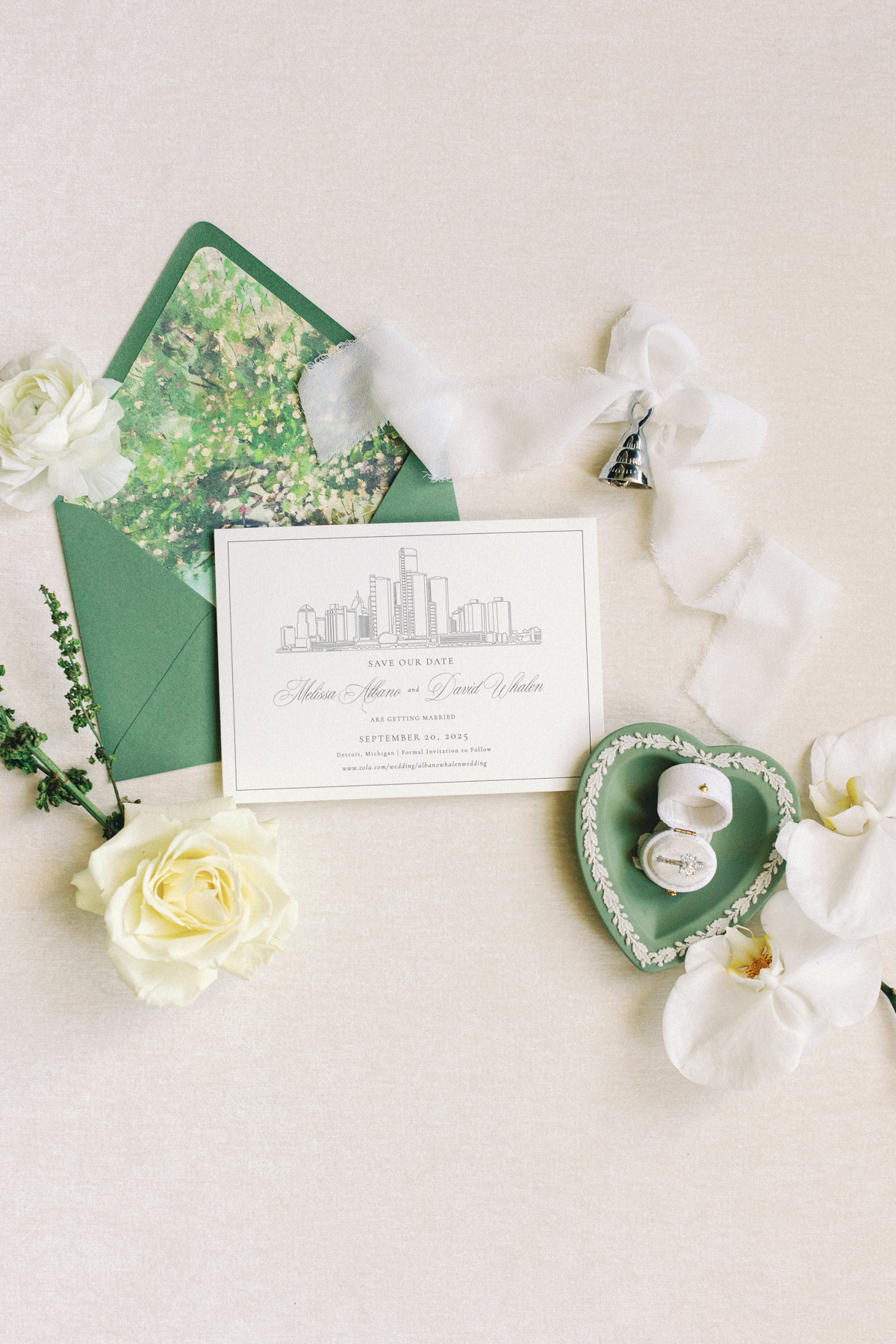Flatlay details included a custom invitation suite with an illustrated envelope liner, a monogram design carried throughout the day (even featured on a cloth drop welcome sign and cocktail napkins), and heirloom-inspired touches that reflected their thoughtful, elegant style.