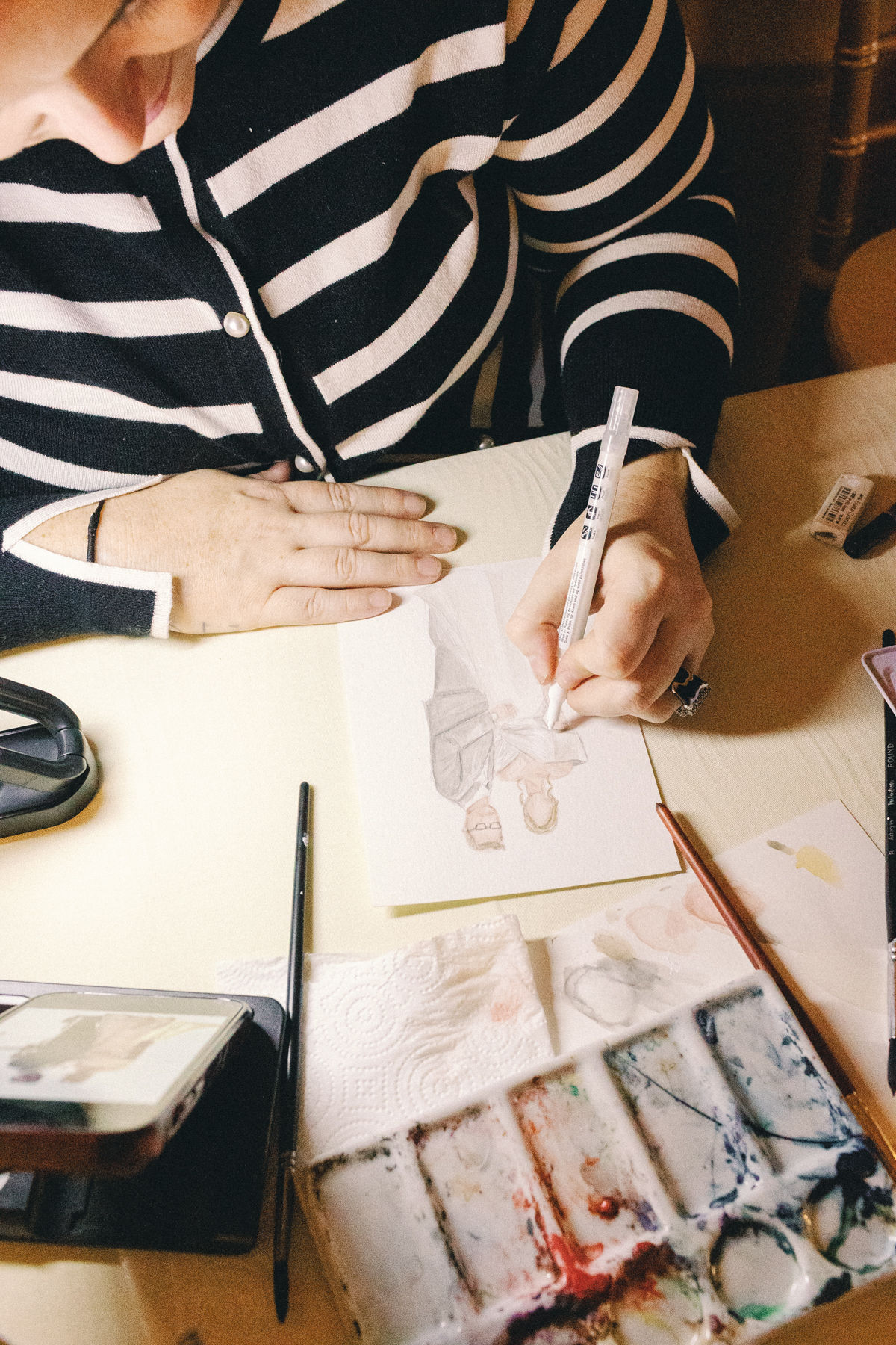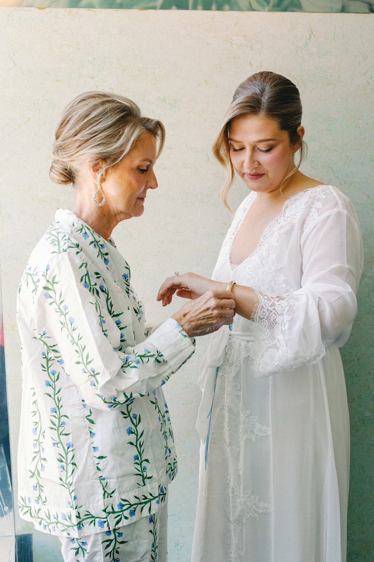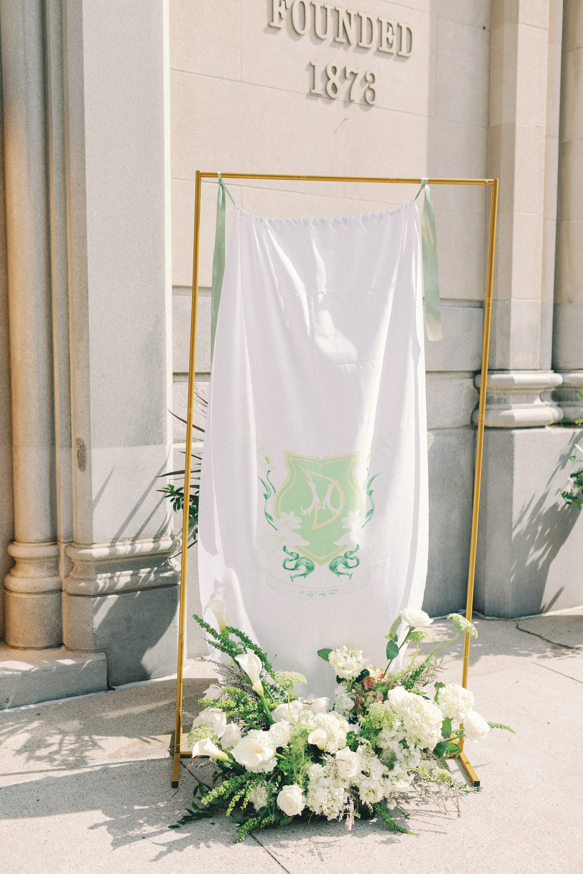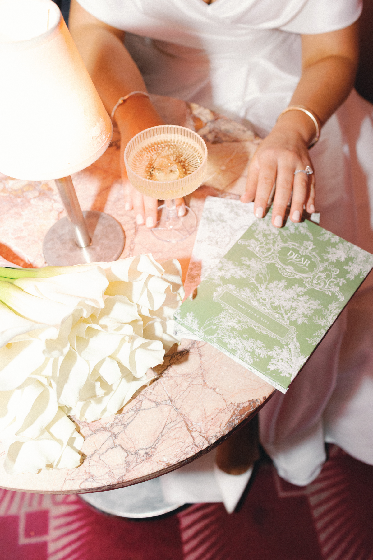 Flatlay details included a custom invitation suite with an illustrated envelope liner, a monogram design carried throughout the day (even featured on a cloth drop welcome sign and cocktail napkins), and heirloom-inspired touches that reflected their thoughtful, elegant style.