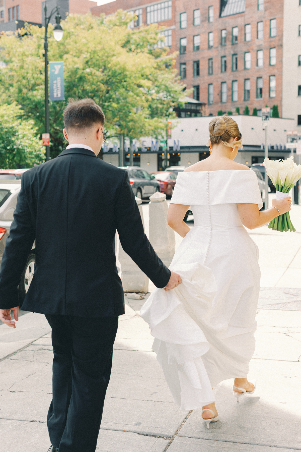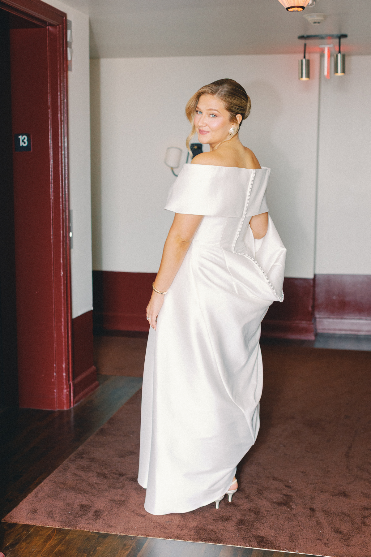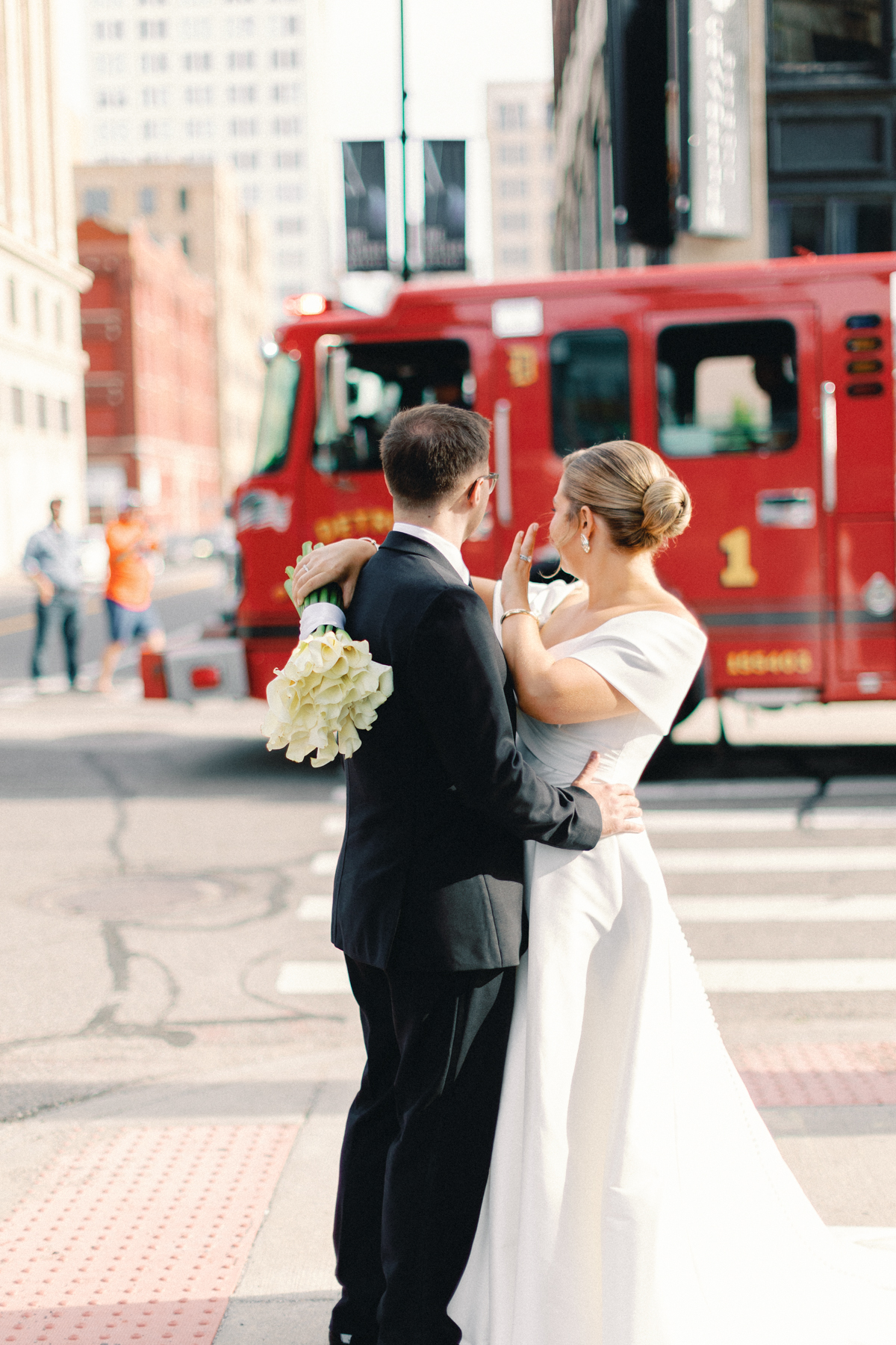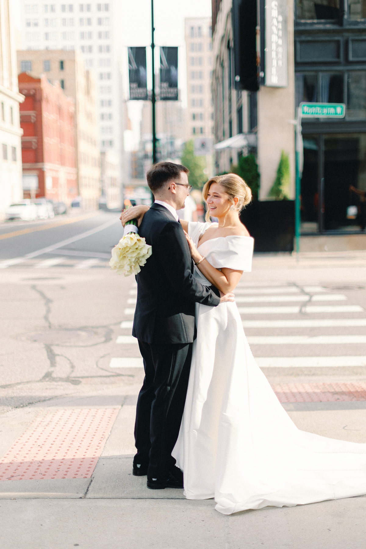 Melissa and David began their wedding morning at The Siren Hotel in Detroit, a boutique hotel with vibrant character and historic charm. Melissa chose the Ashbar as her getting-ready space, surrounded by her bridesmaids, before stepping into her timeless satin A-line, off-the-shoulder gown from Becker’s Bridal.