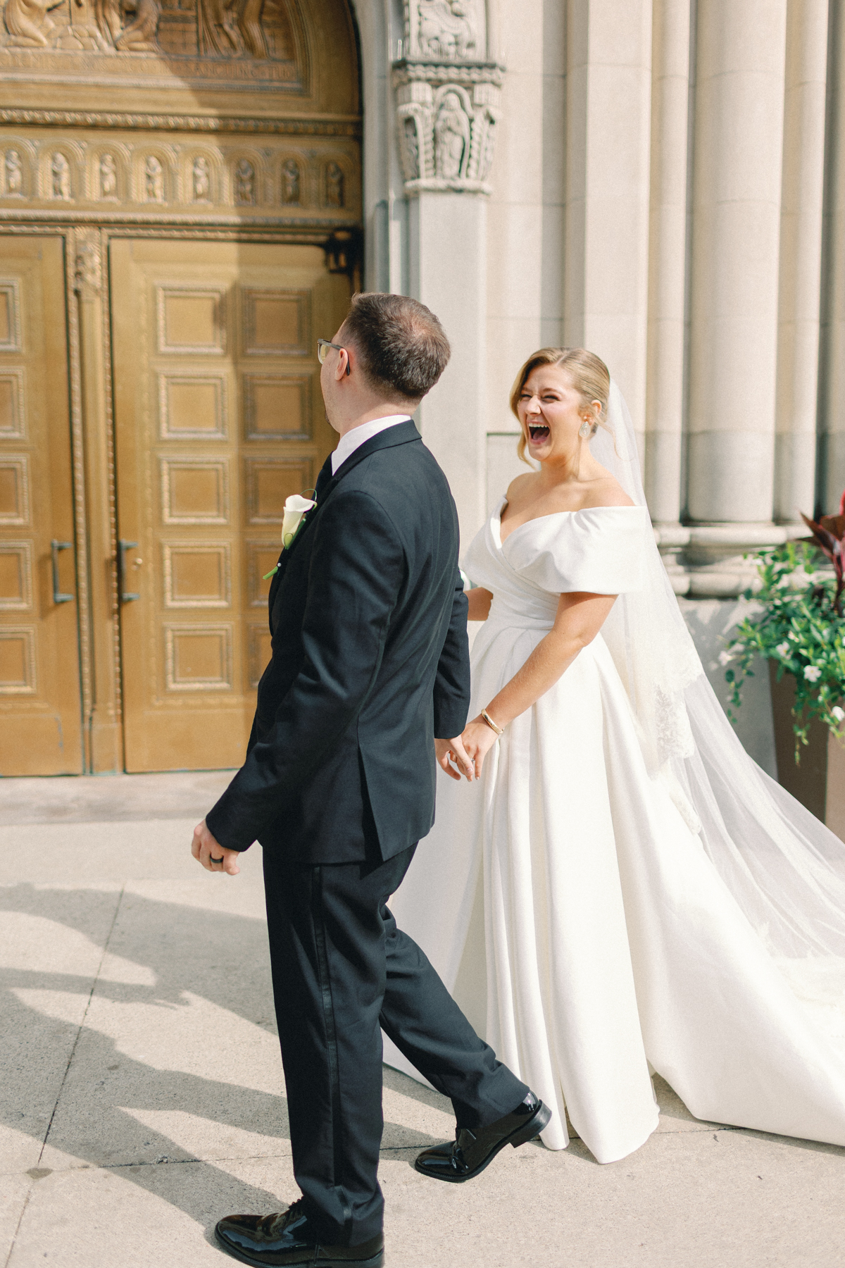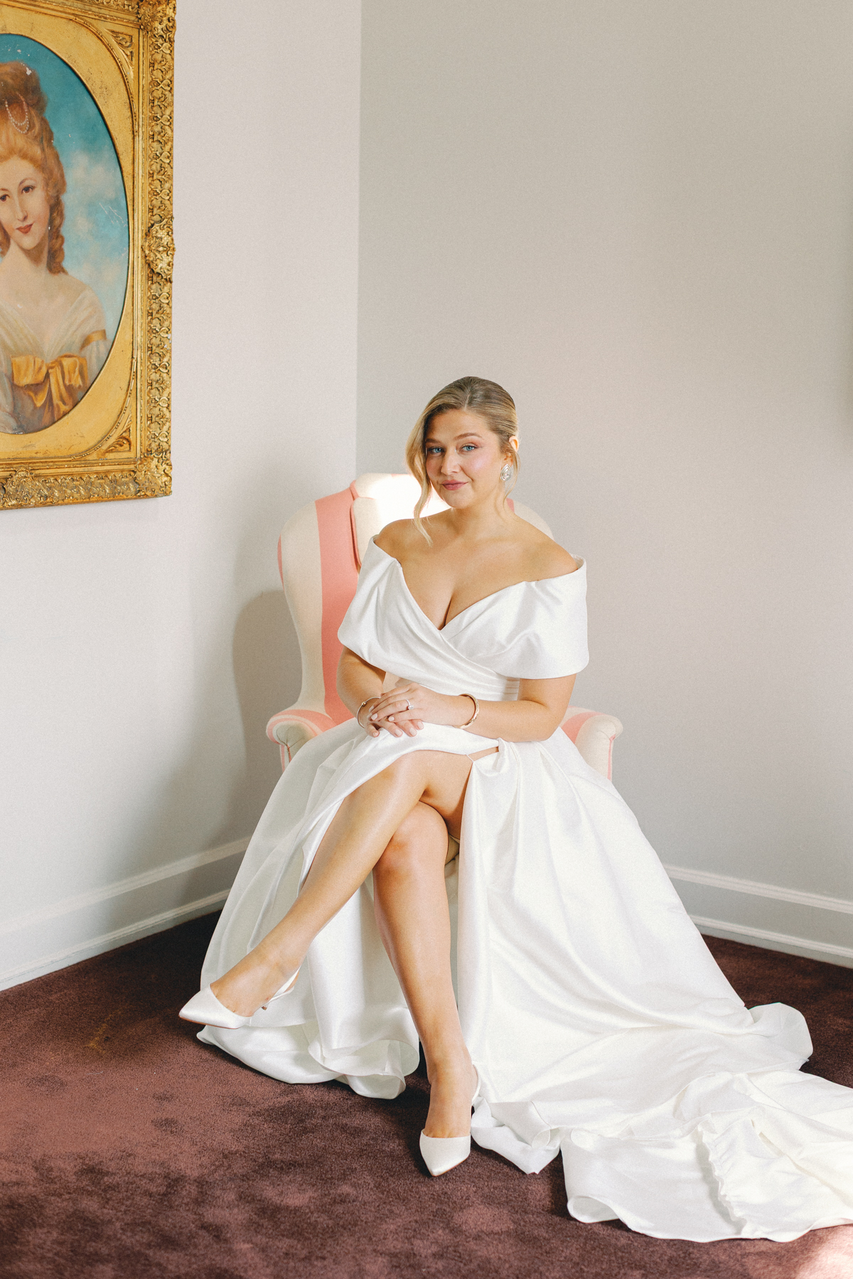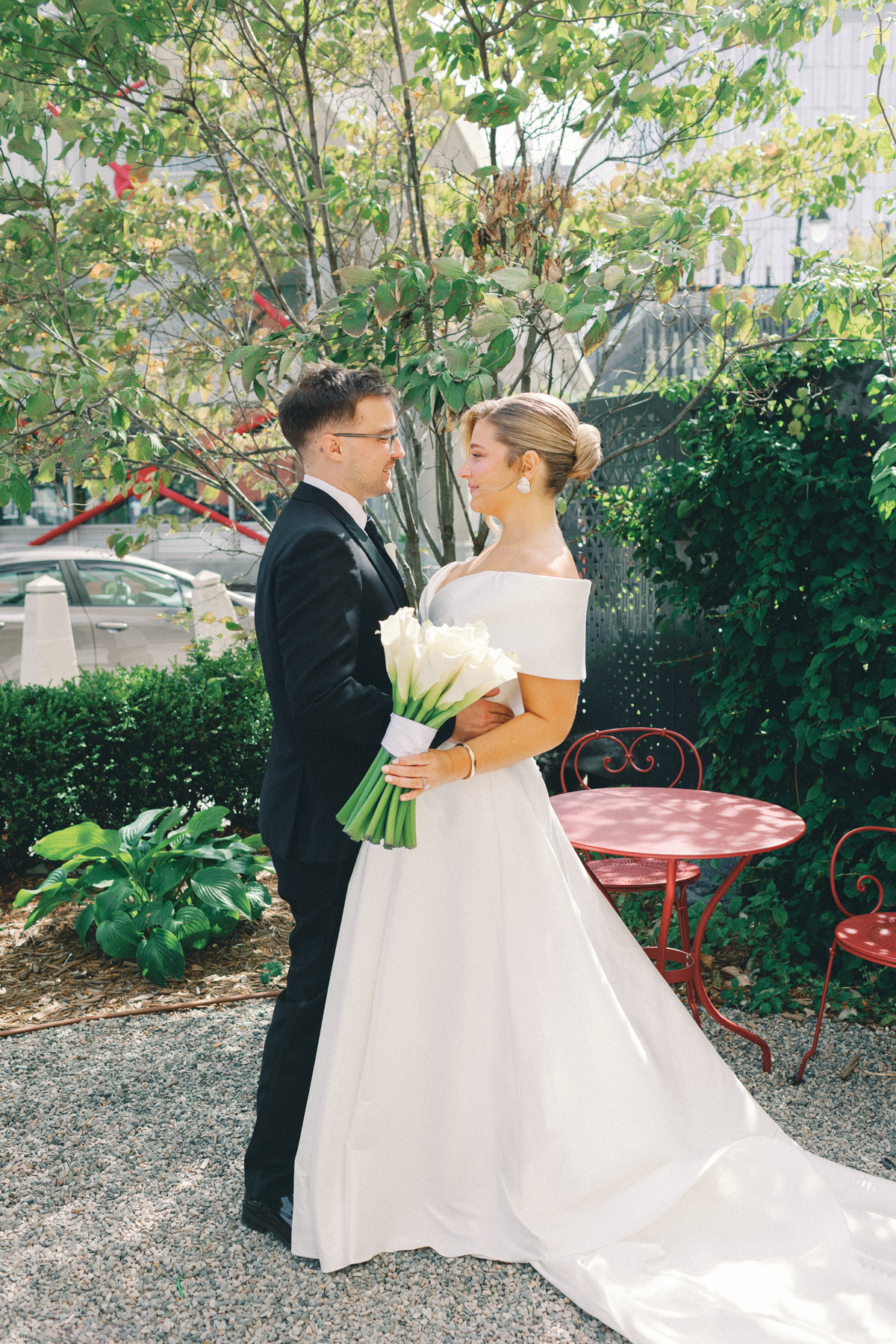 Melissa and David began their wedding morning at The Siren Hotel in Detroit, a boutique hotel with vibrant character and historic charm. Melissa chose the Ashbar as her getting-ready space, surrounded by her bridesmaids, before stepping into her timeless satin A-line, off-the-shoulder gown from Becker’s Bridal.