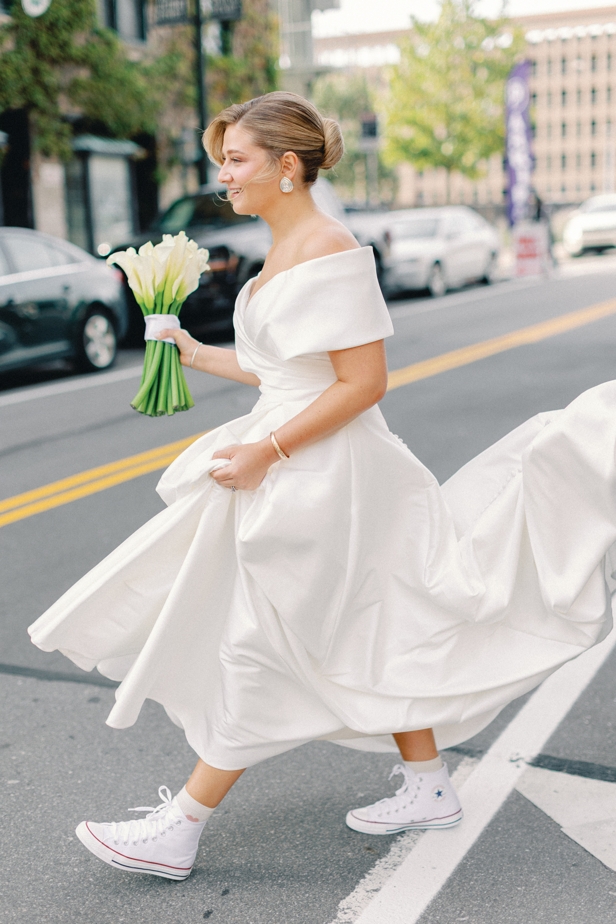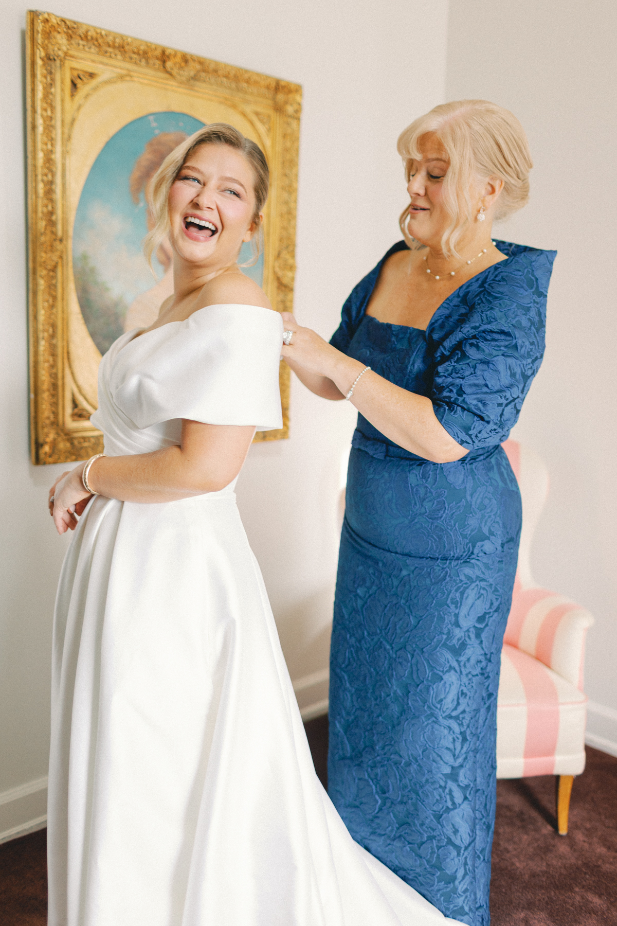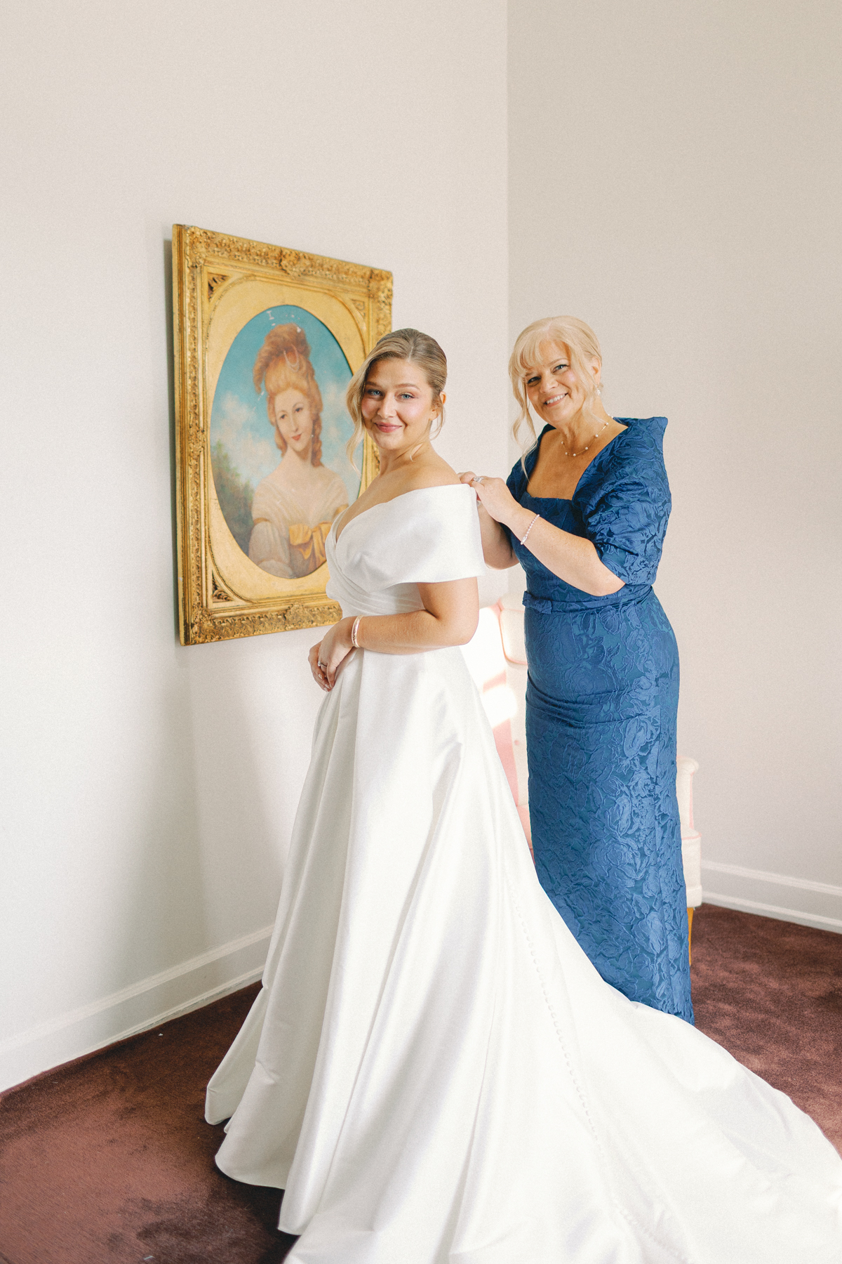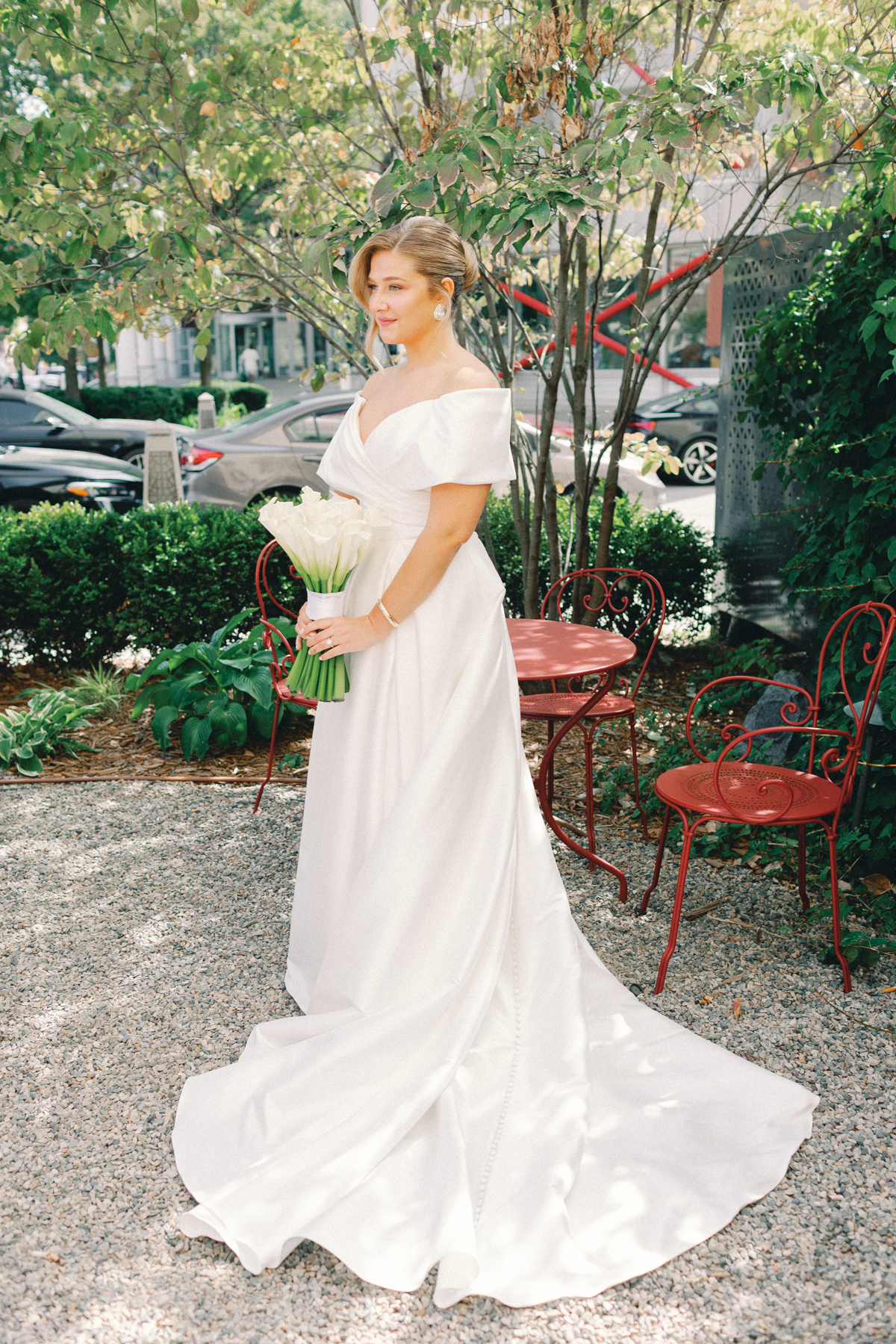 Melissa and David began their wedding morning at The Siren Hotel in Detroit, a boutique hotel with vibrant character and historic charm. Melissa chose the Ashbar as her getting-ready space, surrounded by her bridesmaids, before stepping into her timeless satin A-line, off-the-shoulder gown from Becker’s Bridal.